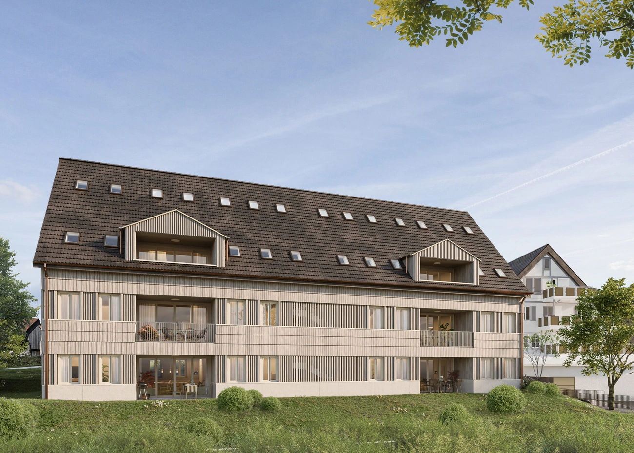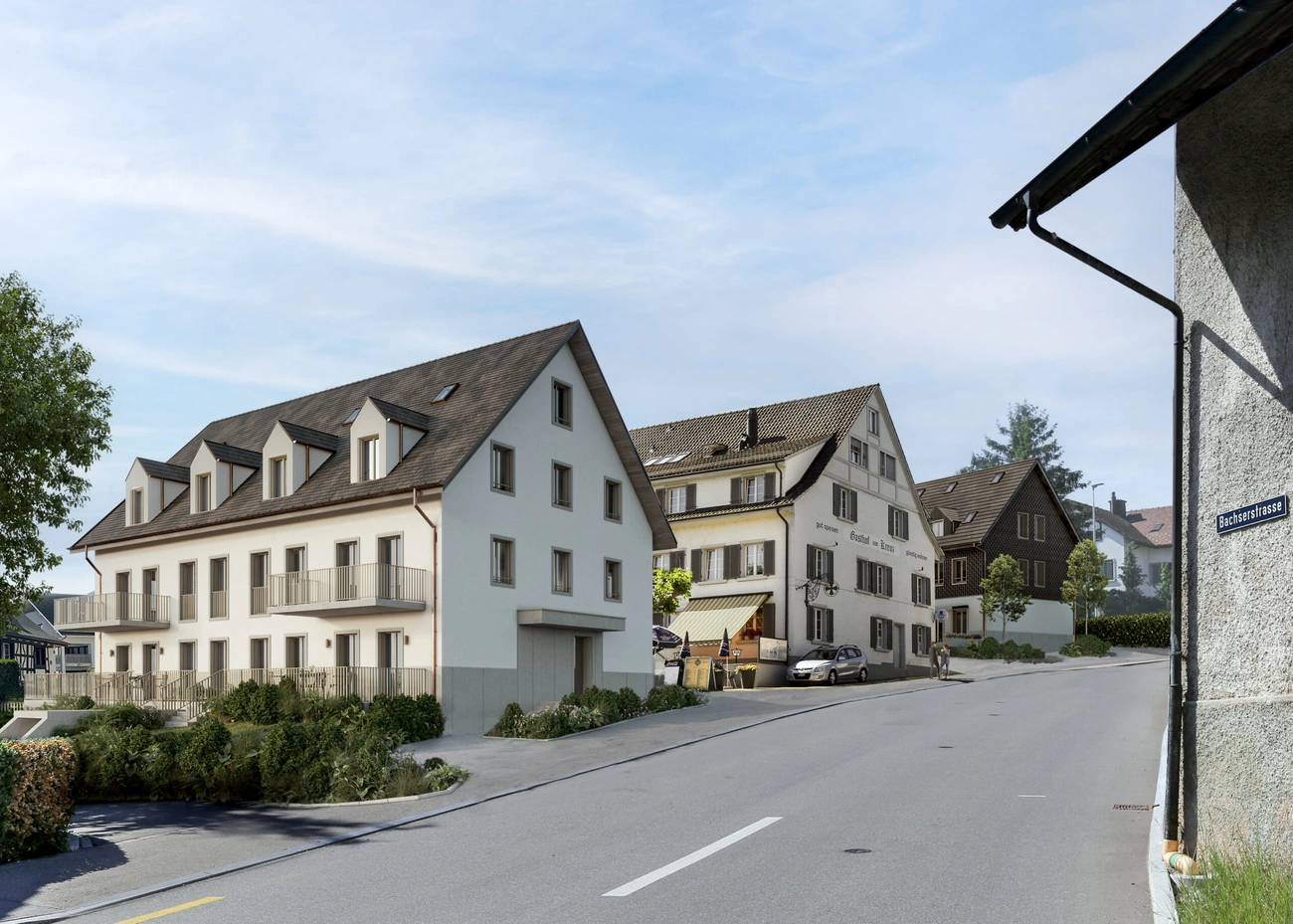 Die Neubauten in der Bachserstrasse in Steinmaur umfassen zwei Mehrfamilienhäuser und drei Reiheneinfamilienhäuser. Im Total weisst die Überbauung 15 Wohneinheiten auf.