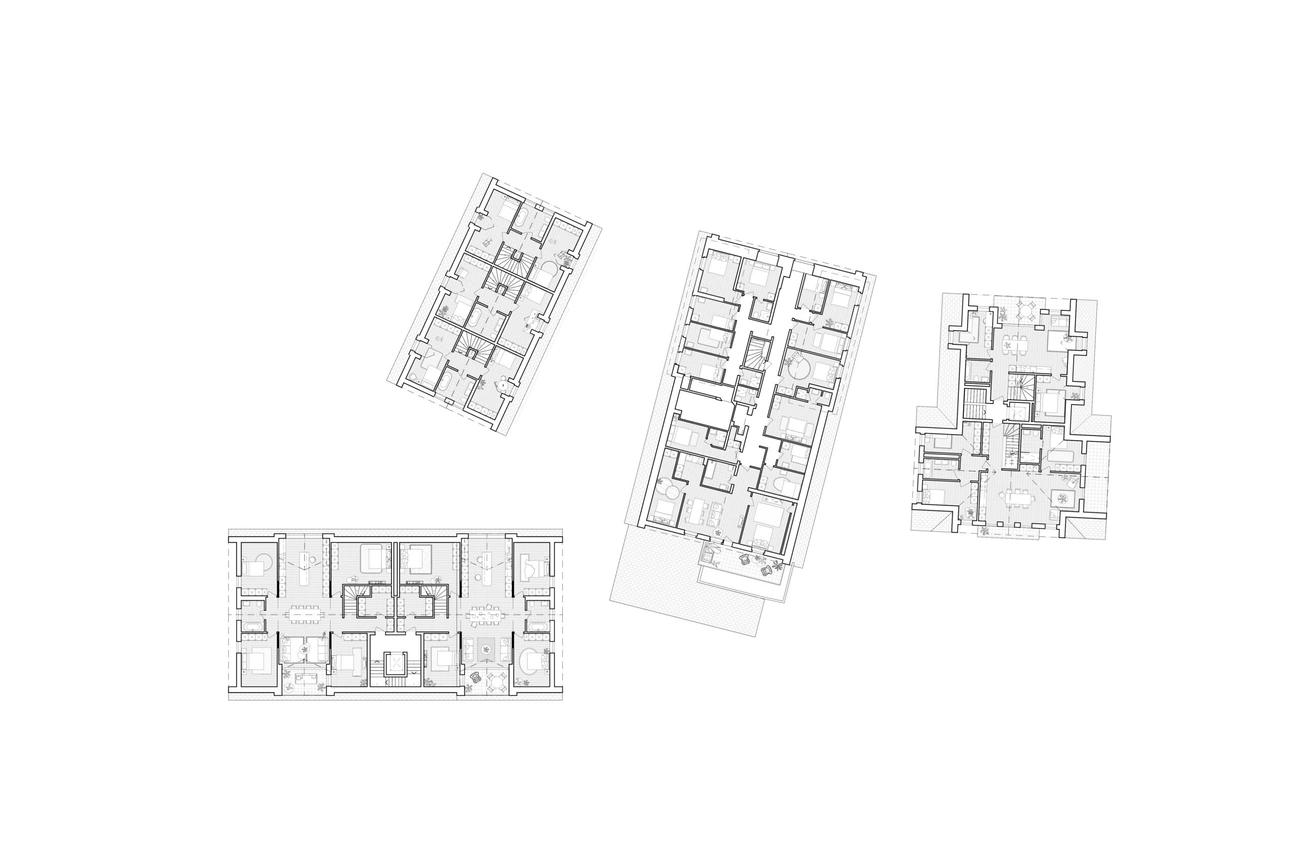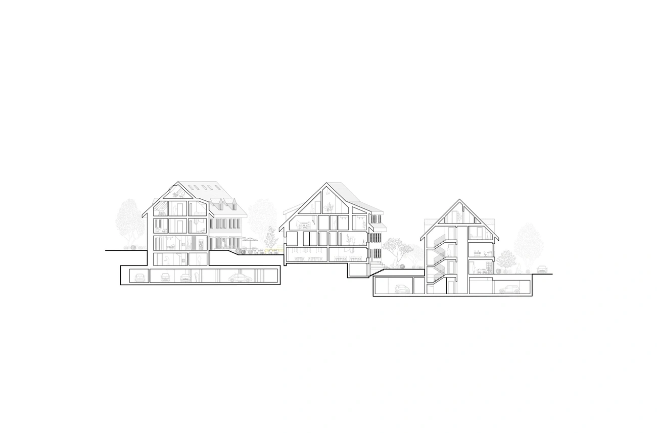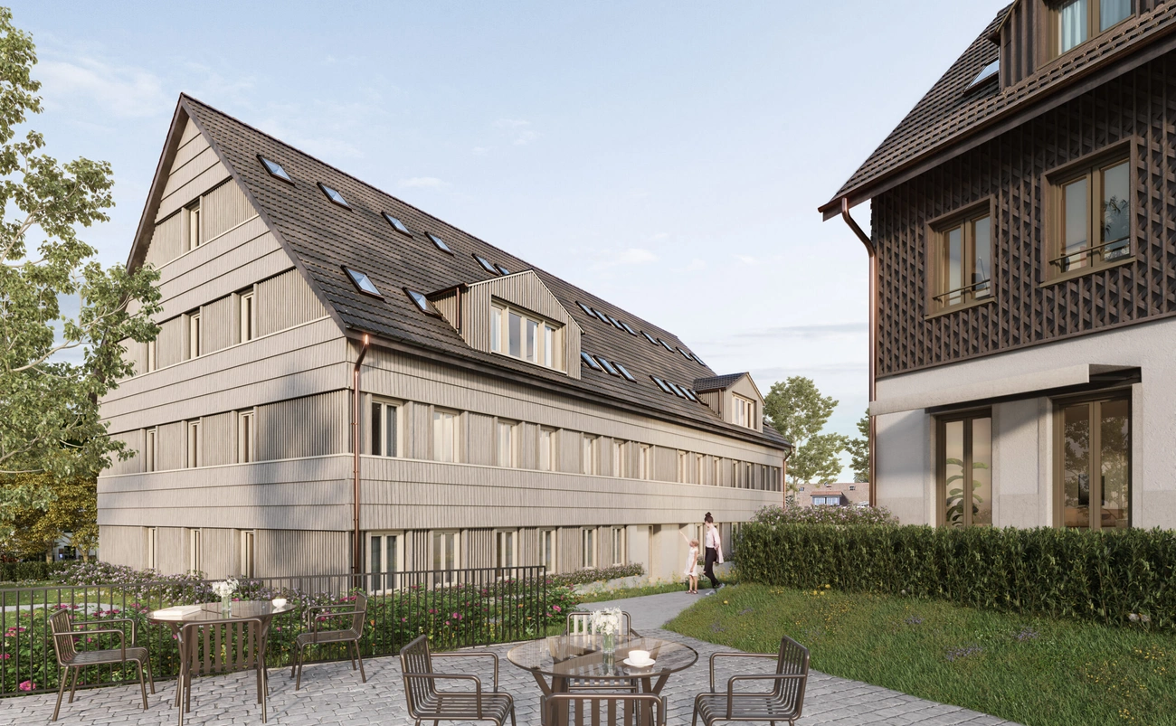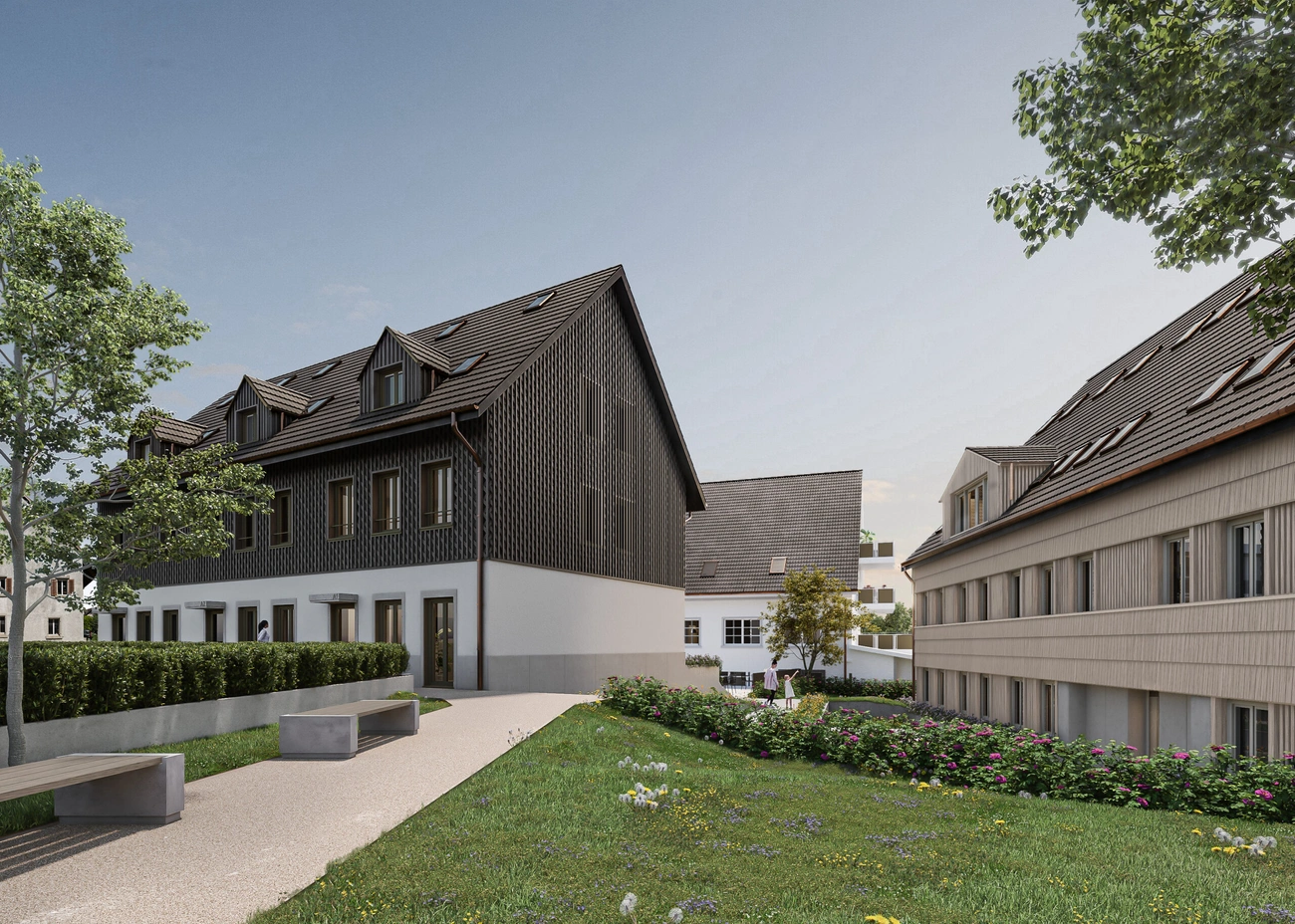 Die zweigeschossigen Holzbauten bilden trotz unterschiedlichem Gebäudecharakter eine visuelle Einheit. Gefasst wird die Überbauung durch gemeinsame Ruhe und Grünflächen im Kern des Gebäudeensembles. So verbinden sich Wohngebäude und Hotel Kreuz zu einem Begegnungsort für Anwohner und Nachbarschaft.