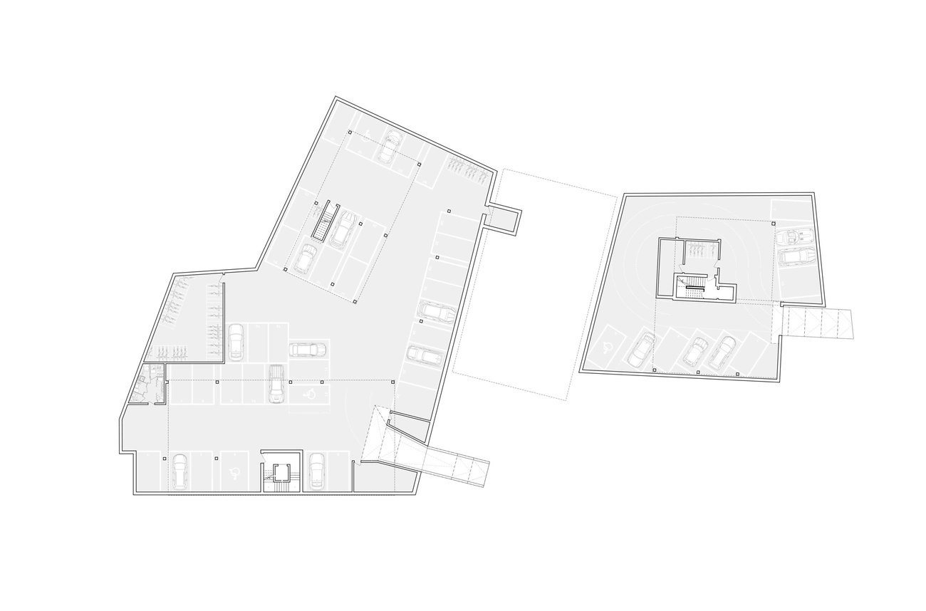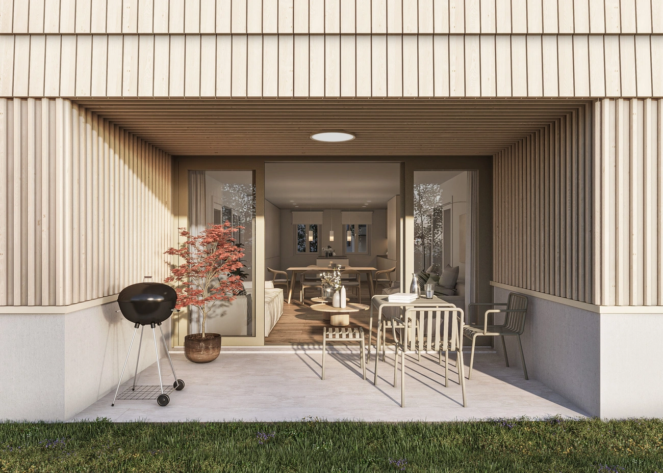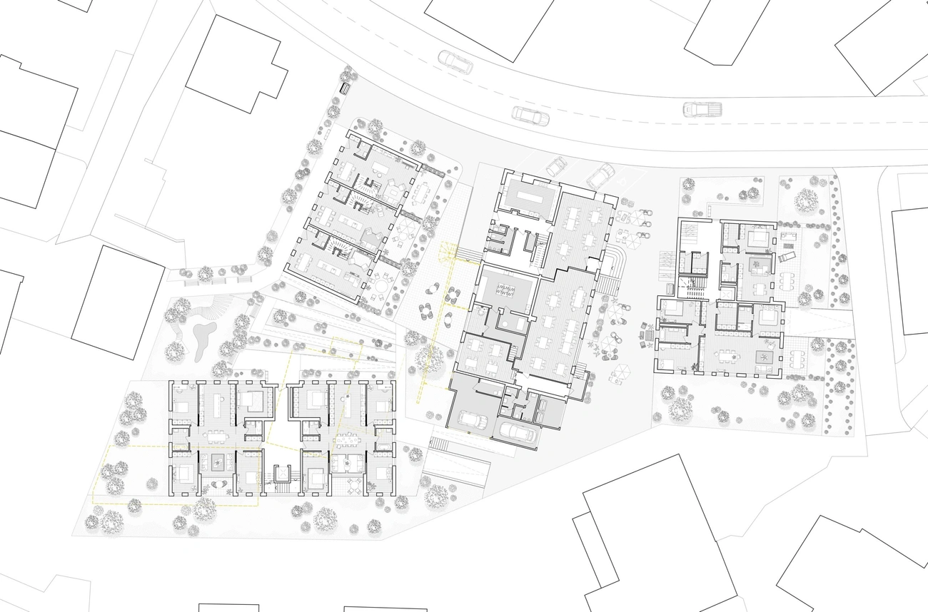 Die zweigeschossigen Holzbauten bilden trotz unterschiedlichem Gebäudecharakter eine visuelle Einheit. Gefasst wird die Überbauung durch gemeinsame Ruhe und Grünflächen im Kern des Gebäudeensembles. So verbinden sich Wohngebäude und Hotel Kreuz zu einem Begegnungsort für Anwohner und Nachbarschaft.