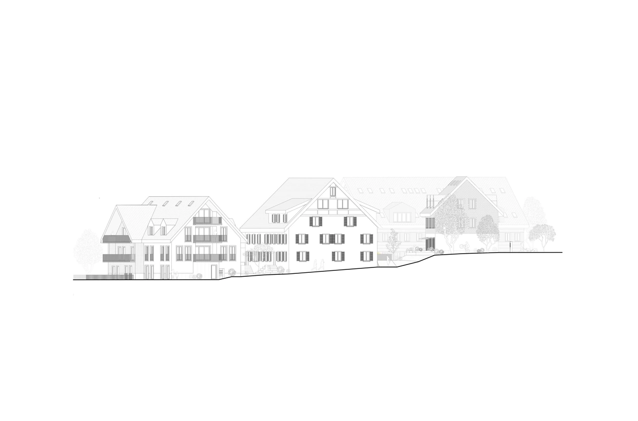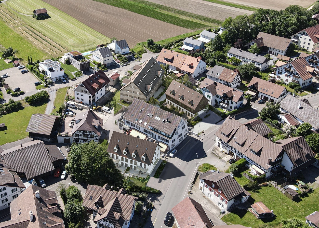Das Ensemble greift die Farben der Kernzone auf. Die Gebäude sind mit Holz und Putz in sanften braun und beige Tönen verkleidet und fügen sich harmonisch in das bestehende Ortsbild ein. Alle Gebäude weissen das gleiche Farbschema bei unterschiedlicher Fassadengestaltung auf.