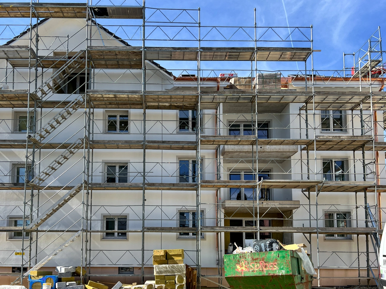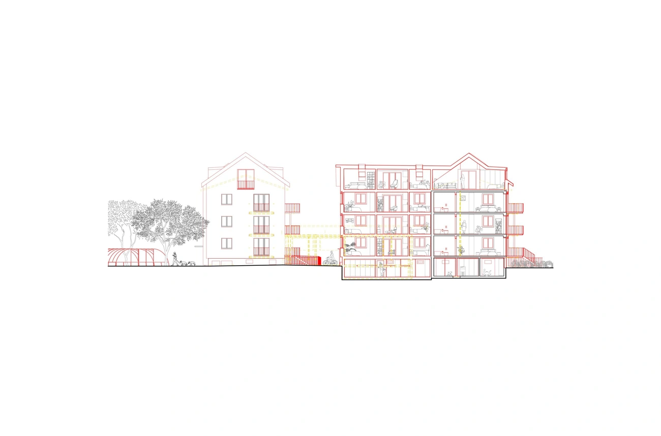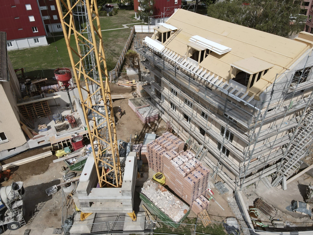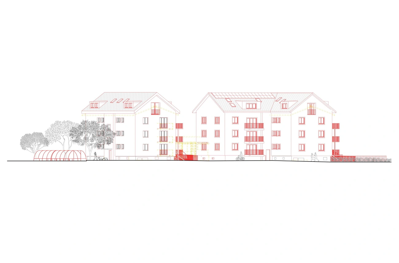 Die beiden verbundenen Wohnhäuser mit Hauptfassade gegen Süden, werden umfassend saniert. Zudem werden die 12 bestehenden Wohneinheiten im Zuge der Modernisierung neu aufgeteilt. So entstehen mit der Aufstockung total 28 Wohnungen.
