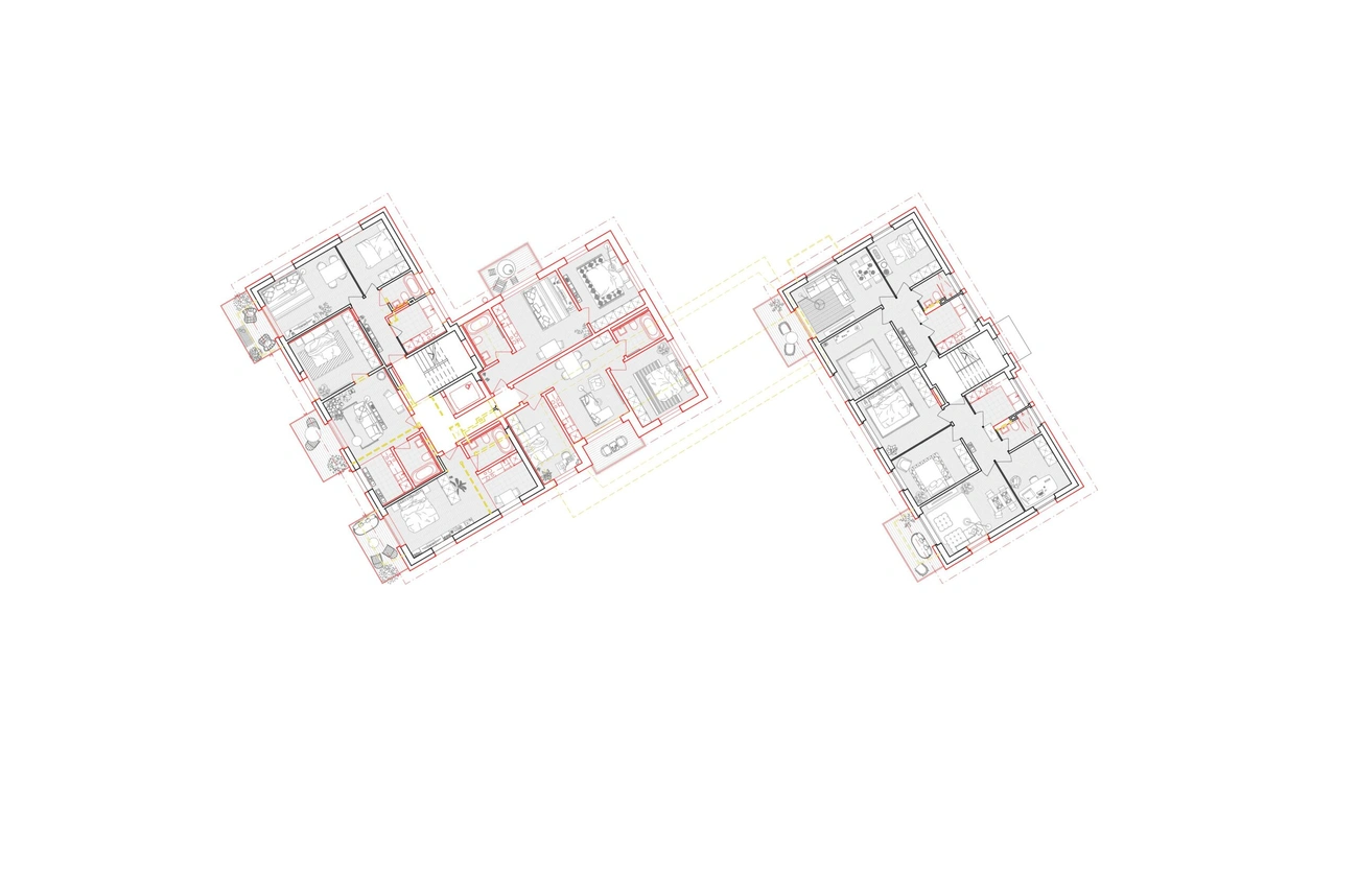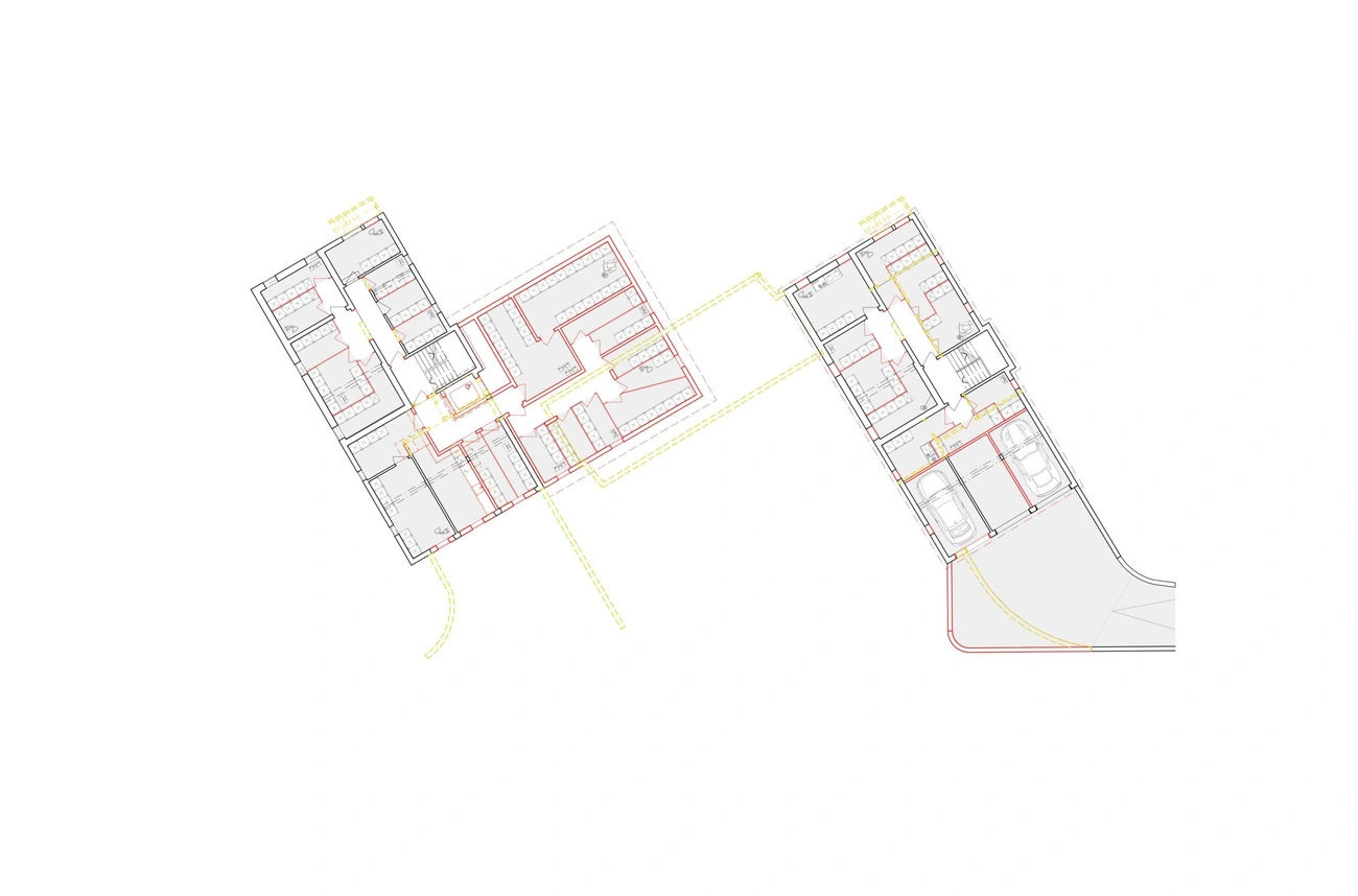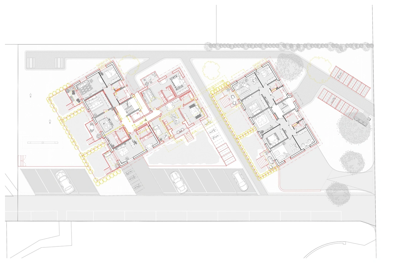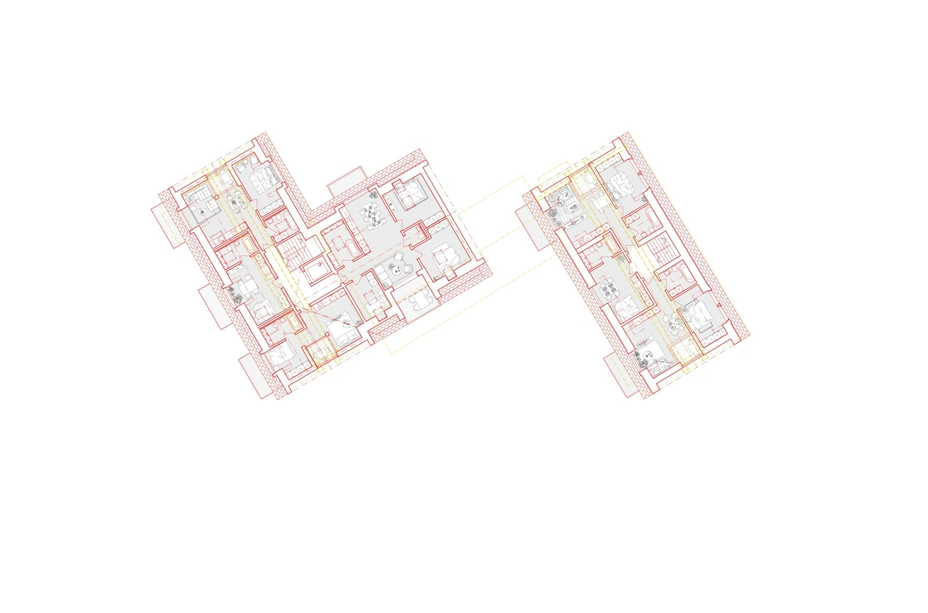 Die beiden verbundenen Wohnhäuser mit Hauptfassade gegen Süden, werden umfassend saniert. Zudem werden die 12 bestehenden Wohneinheiten im Zuge der Modernisierung neu aufgeteilt. So entstehen mit der Aufstockung total 28 Wohnungen.
