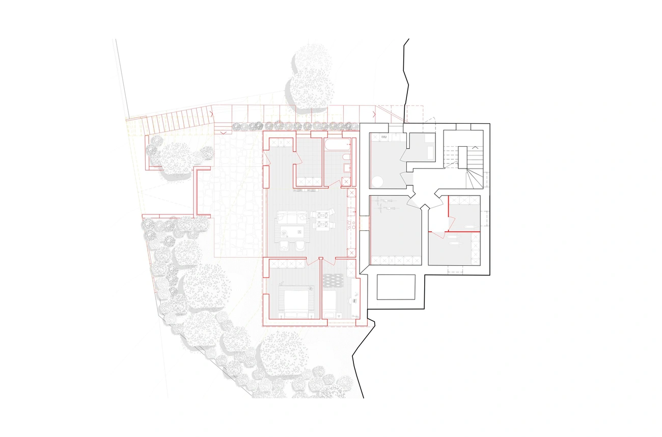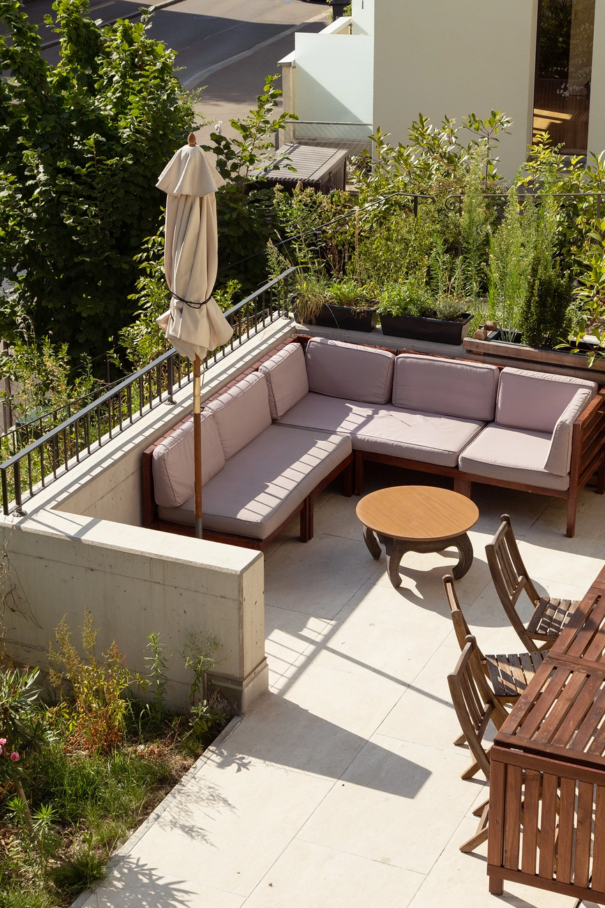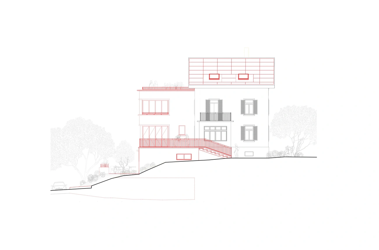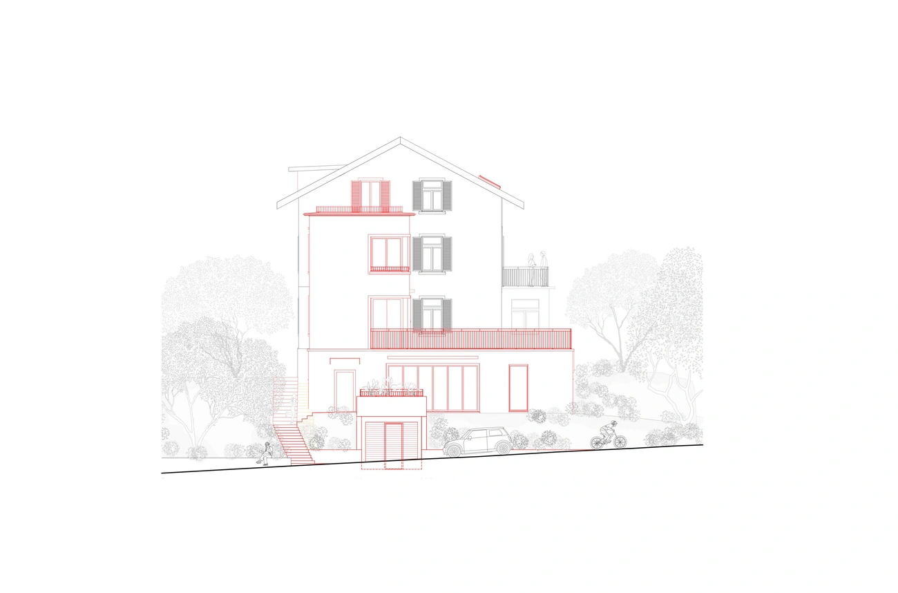 Zudem erhielt das Mehrfamilienhaus eine Erweiterung in Form eines Anbaus in Holzbauweise, welcher die bestehenden Wohnungen vergrössert. Das Untergeschoss des Anbaus ist in Sichtbeton ausgeführt und beinhaltet eine Tiefgarage. Die auf dem Anbau liegende Dachterrasse bietet eine Aussicht über die Dächer des Zürcher Seefelds bis auf den Zürichsee.