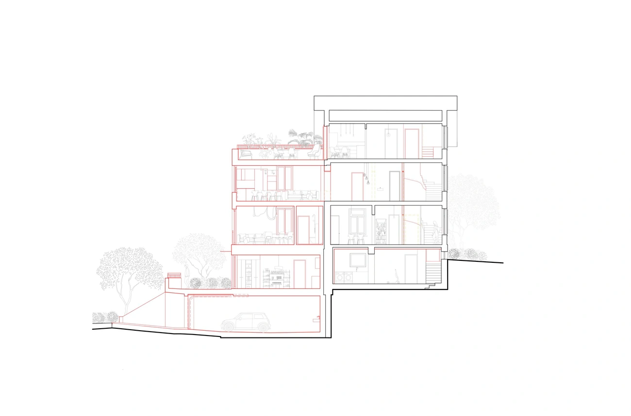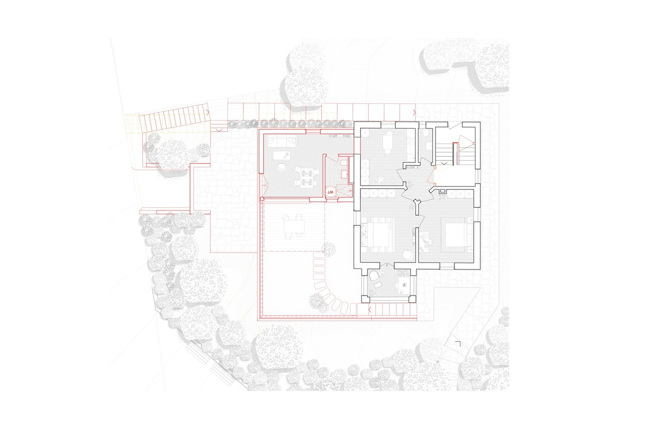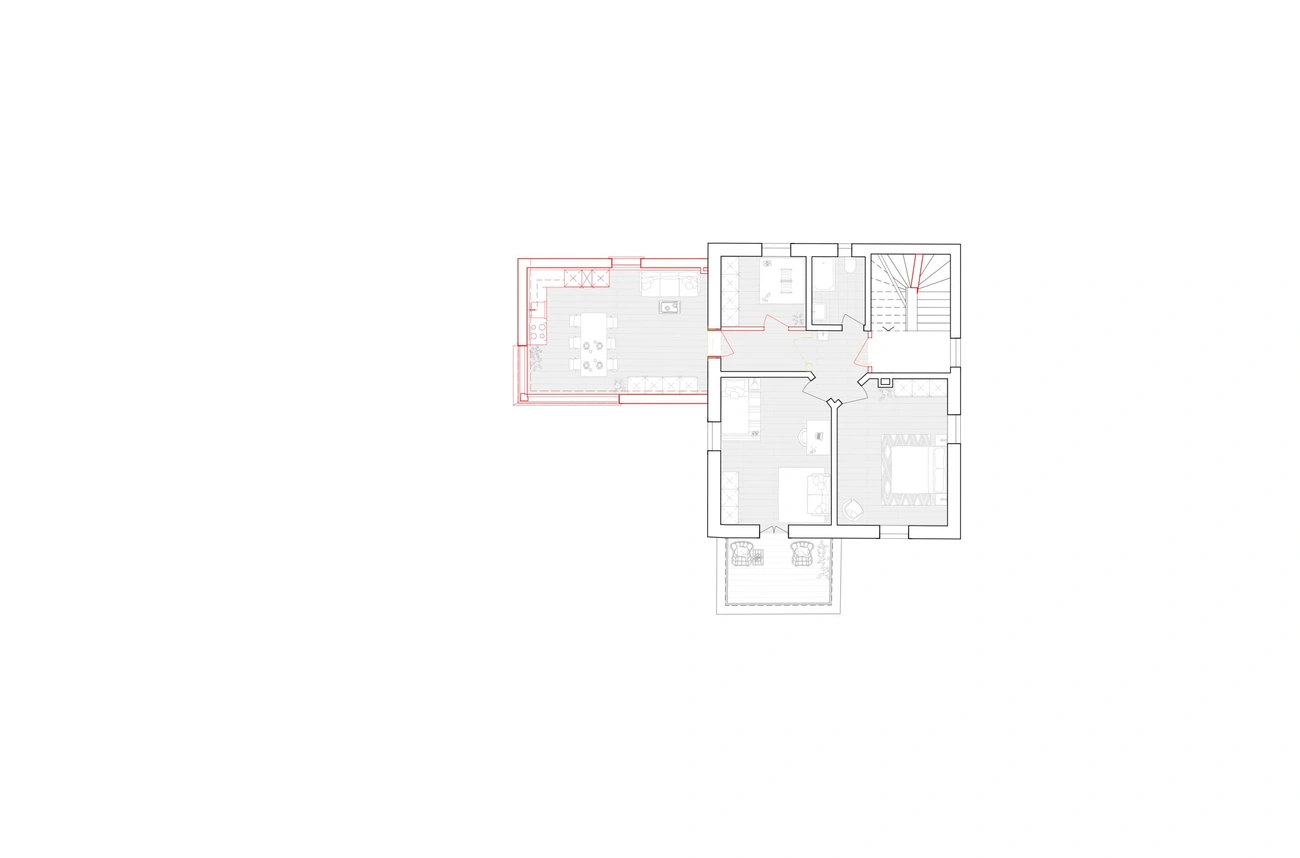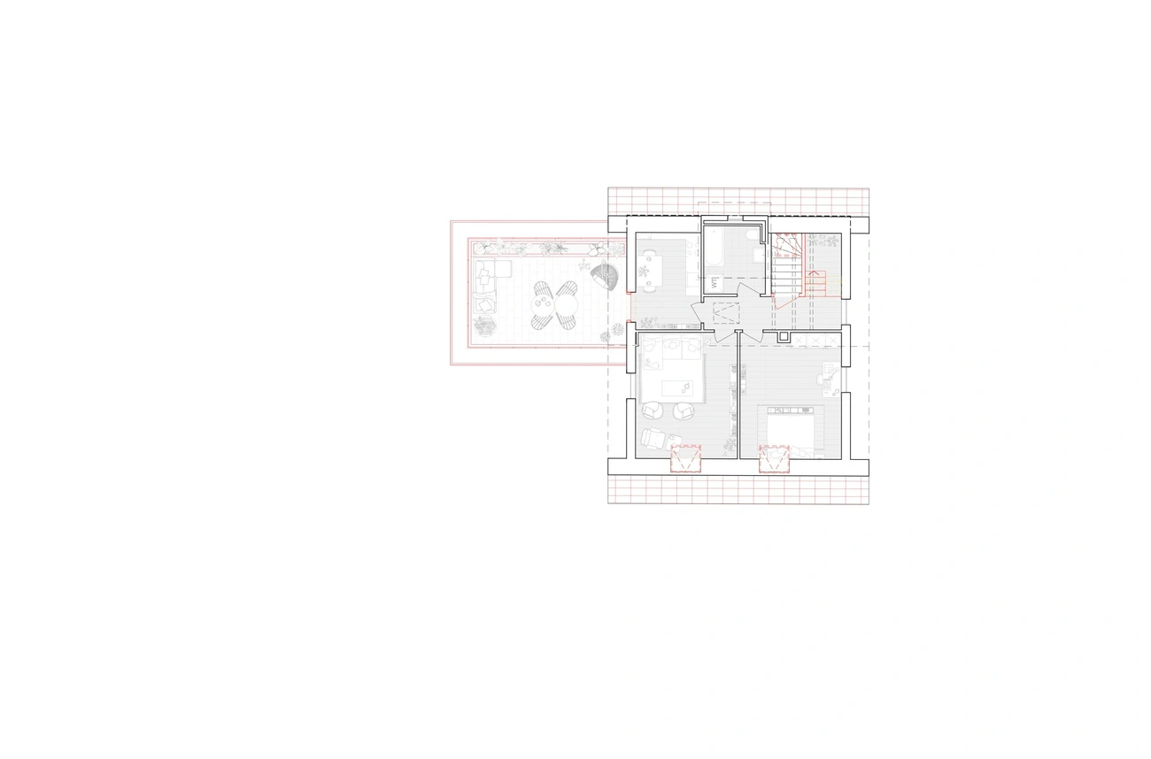 Zudem erhielt das Mehrfamilienhaus eine Erweiterung in Form eines Anbaus in Holzbauweise, welcher die bestehenden Wohnungen vergrössert. Das Untergeschoss des Anbaus ist in Sichtbeton ausgeführt und beinhaltet eine Tiefgarage. Die auf dem Anbau liegende Dachterrasse bietet eine Aussicht über die Dächer des Zürcher Seefelds bis auf den Zürichsee.