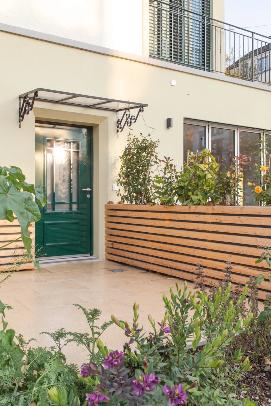 Die Fassade im Bestand wurde farblich aufgefrischt und fügt zusammen mit dem Anbau harmonisch in den Kontext aus villenartigen Häusern ein.