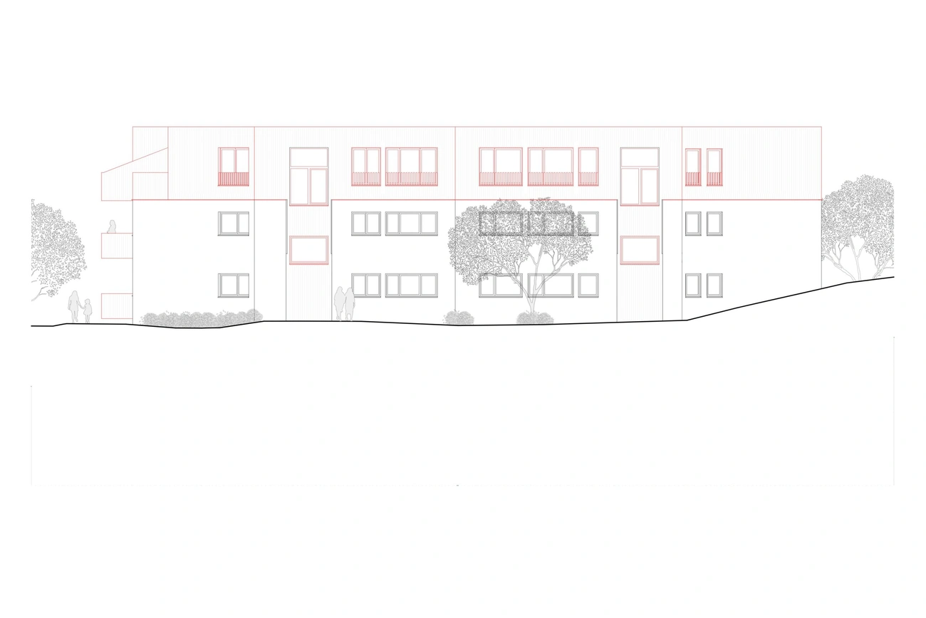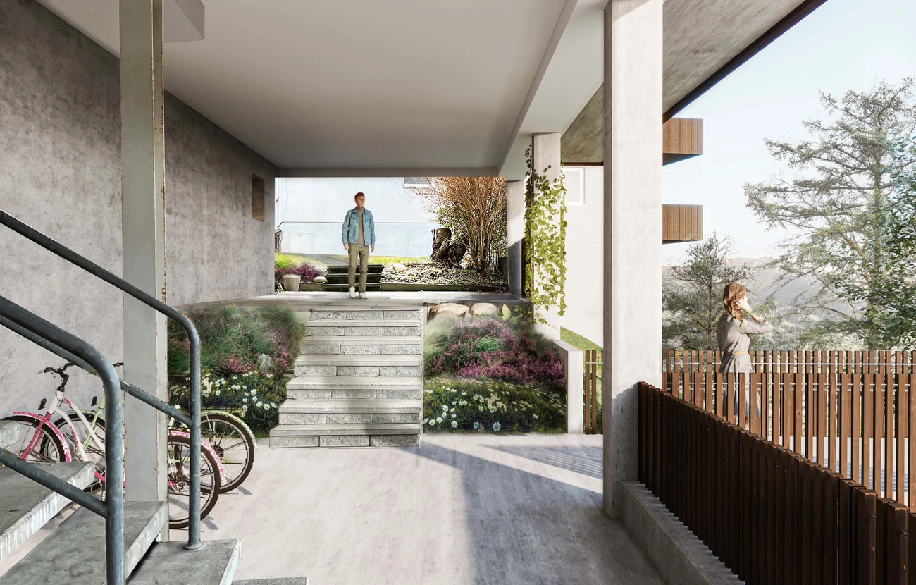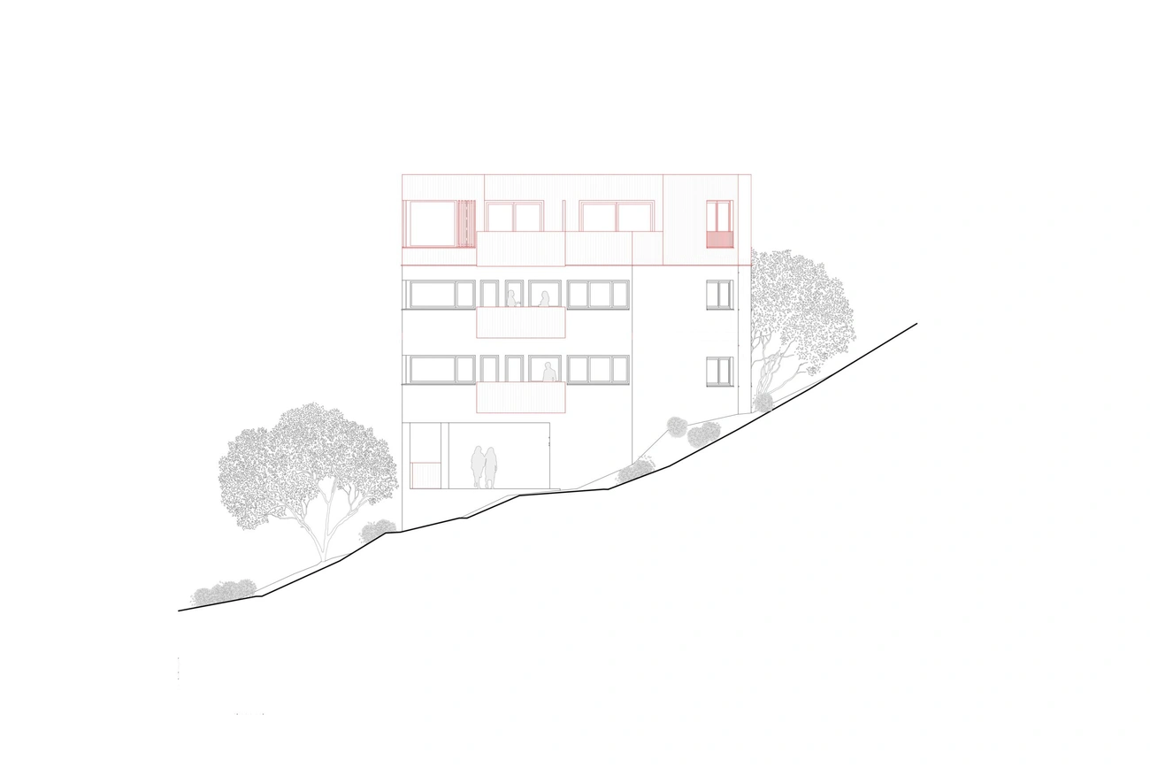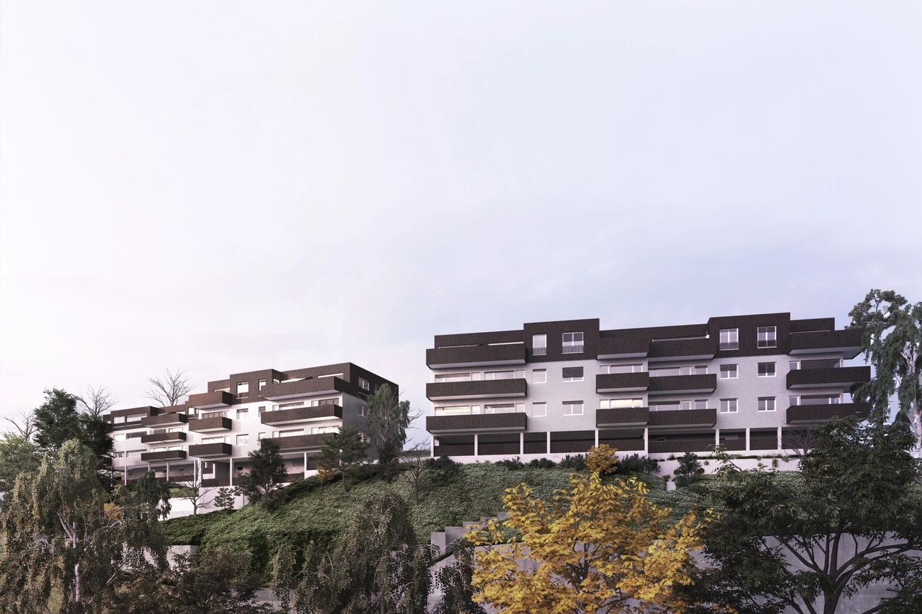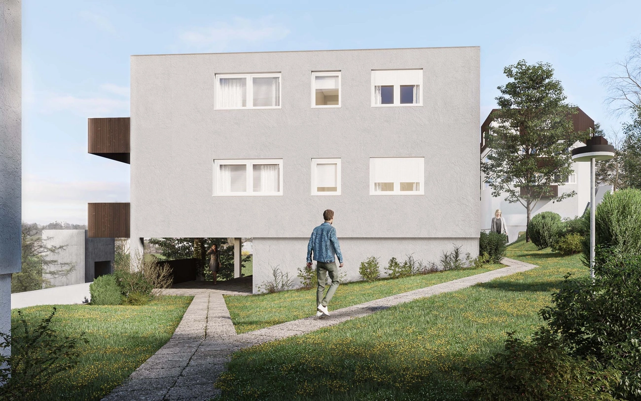 Die bestehenden Mehrfamilienhäuser der Häuser Nummer 3+5 und 9+11 werden um ein Geschoss erweitert, die offenen Untergeschosse, welche talseitig oberirdisch und offen sind, werden teilweise geschlossen und mit Wohnungen oder Kellerräumen versehen. Zusätzlich wird ein freistehender Liftturm, welcher den Zugangsweg zu allen Hauseingängen erschliesst.