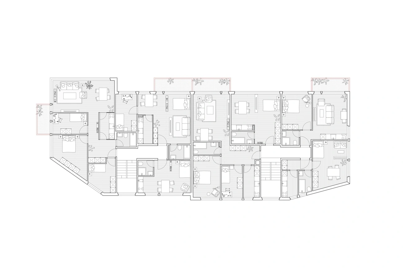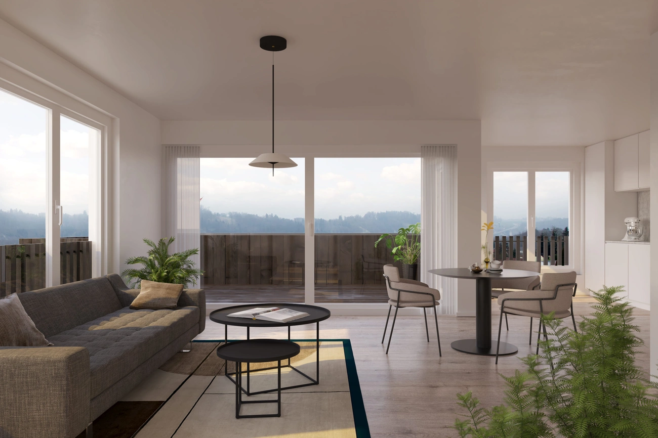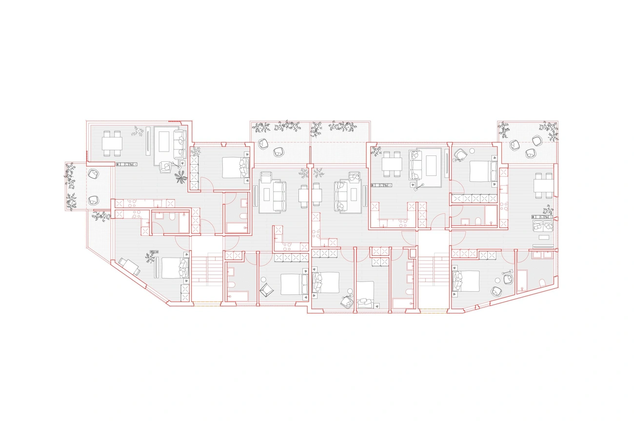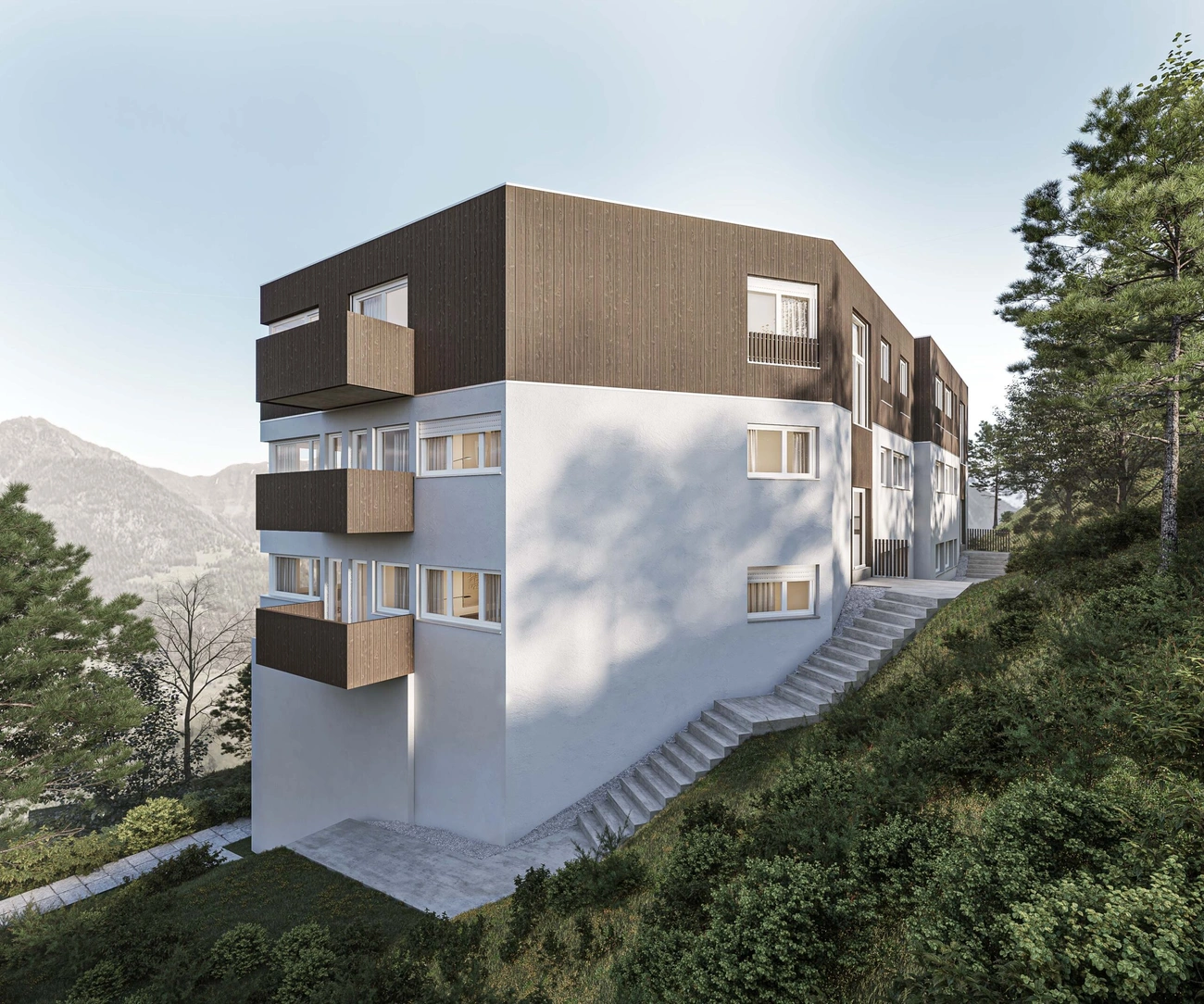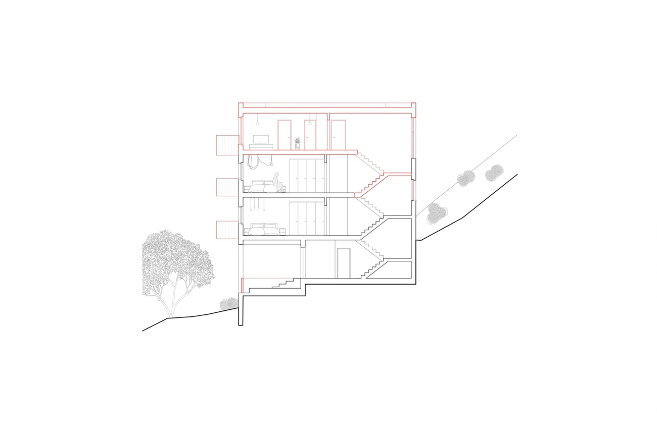 Die bestehenden Mehrfamilienhäuser der Häuser Nummer 3+5 und 9+11 werden um ein Geschoss erweitert, die offenen Untergeschosse, welche talseitig oberirdisch und offen sind, werden teilweise geschlossen und mit Wohnungen oder Kellerräumen versehen. Zusätzlich wird ein freistehender Liftturm, welcher den Zugangsweg zu allen Hauseingängen erschliesst.