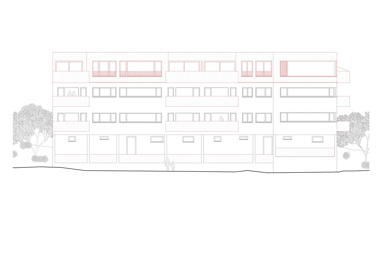 Die Aufstockungen und die Balkongeländer, welche im Bestand ersetzt werden, werden in Holz erstellt. Die bestehenden Fassaden werden neu gestrichen.