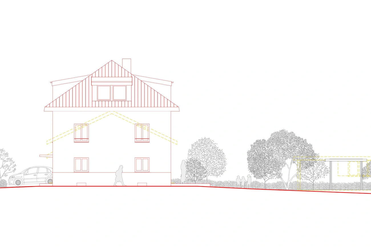 Dieses Haus befindet sich in einer Umgebung, in der Häuser ohne besondere Rücksicht auf ihre Umgebung gebaut werden – gebaut wie Objekte inmitten eines Grundstücks. Daher war die Idee des Städtebaus, ein sehr präzises Volumen zu schaffen, das das Haus völlig neu ausrichtete: die Hauptausrichtung des Gebäudes zu verändern, es in Richtung seines grossen Gartens zu lenken und einen Abschluss zur Hauptstrasse zu schaffen. Die Konstruktion ist einfach, aber anspruchsvoll.