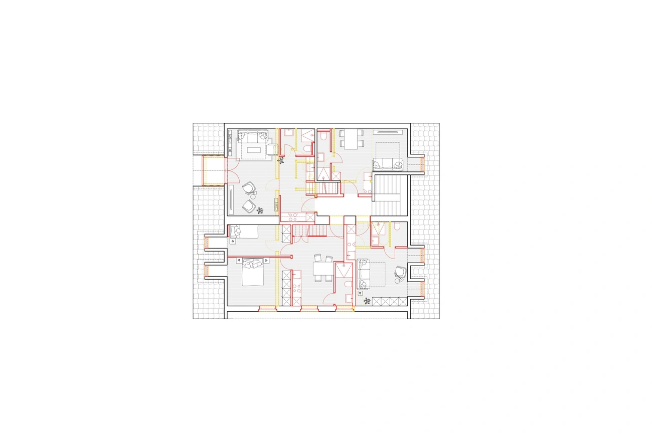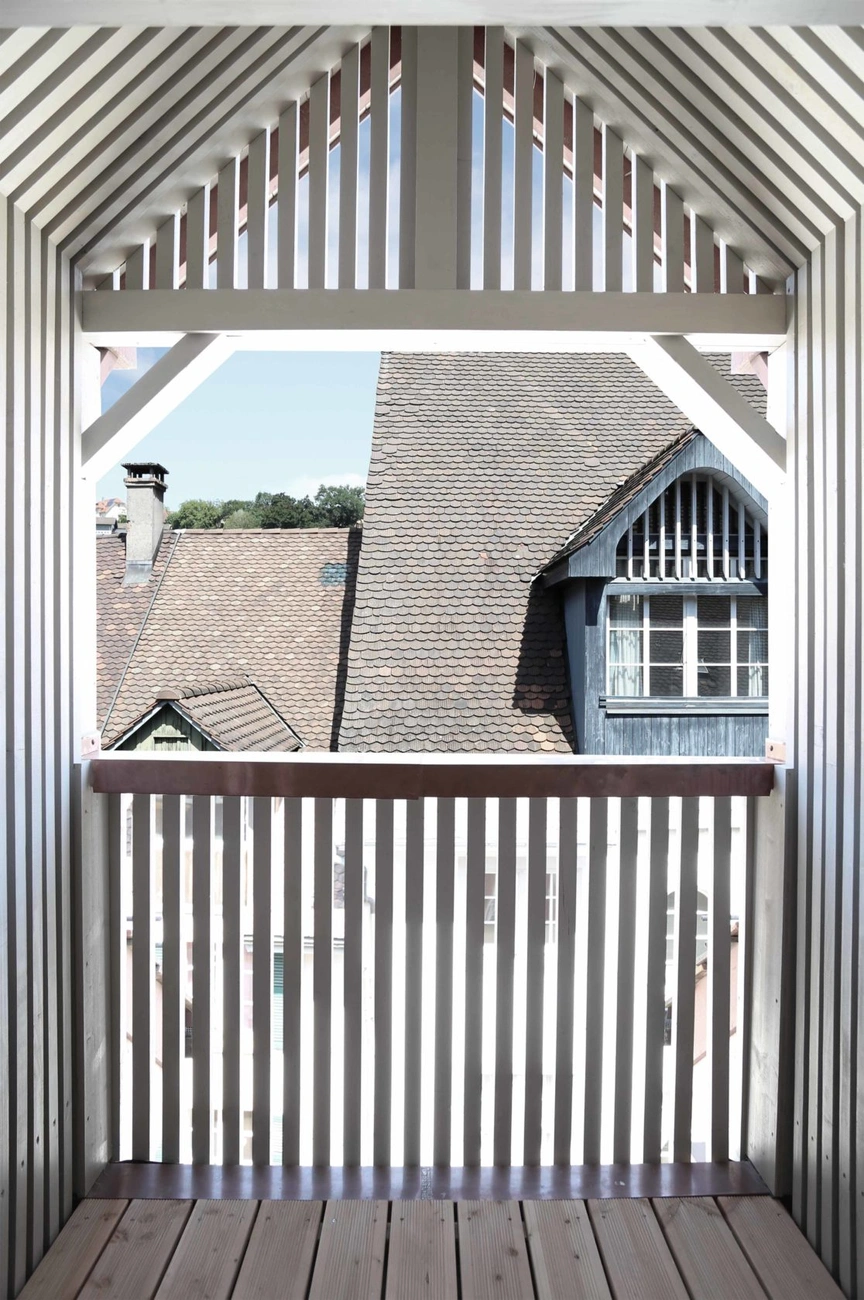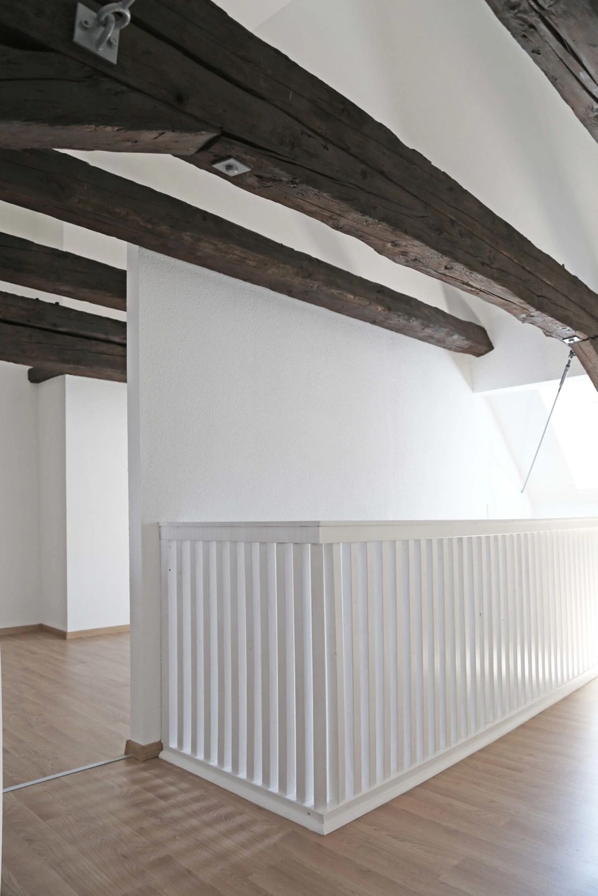 Das Dachgeschoss wurde ausgebaut und teilt sich in vier Wohnungen auf. Zwei davon sind mit einer Galerie über zwei Geschosse verbunden. Die westliche Giebelseite wird nach Fertigstellung eine hölzerne Loggia aufweisen.