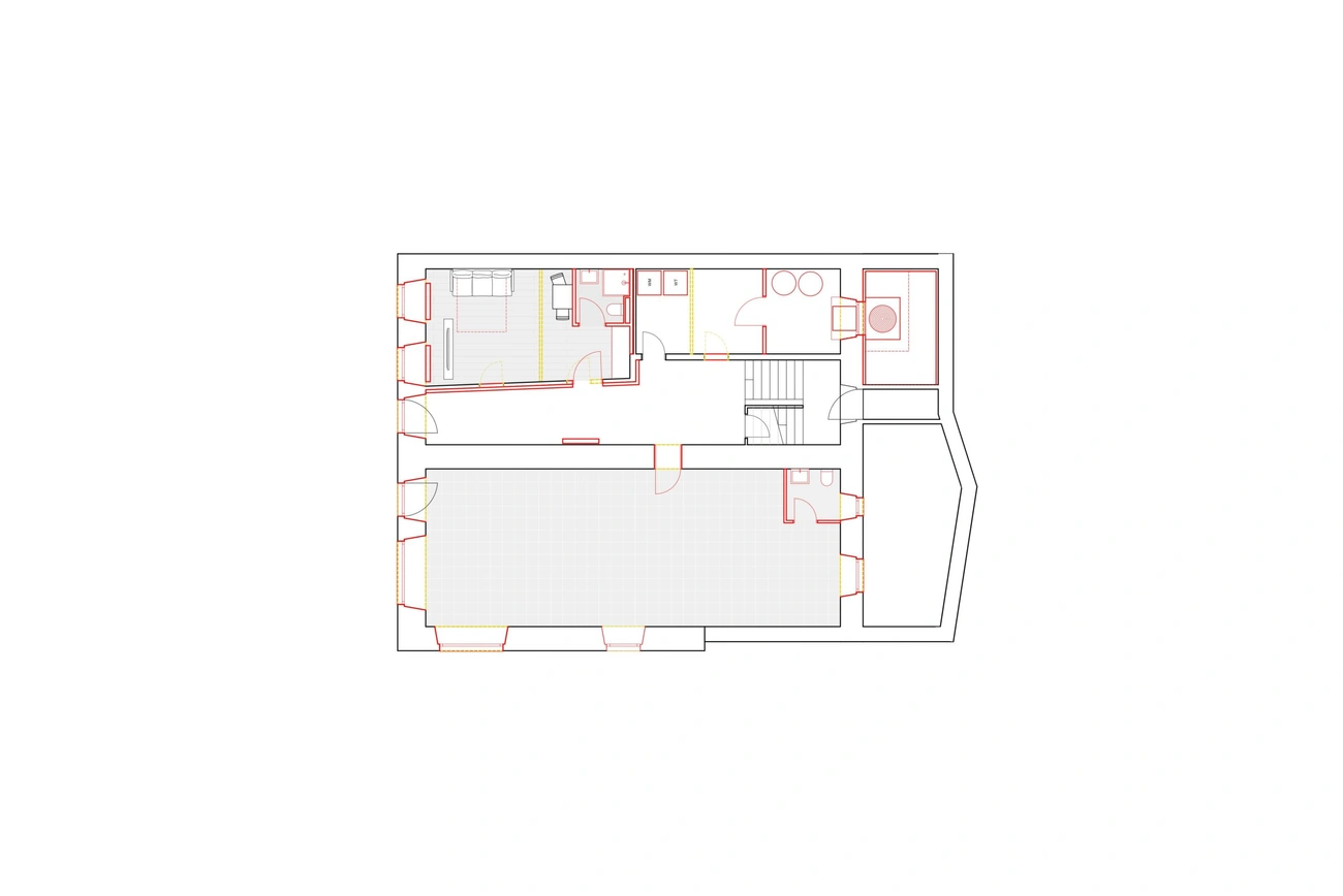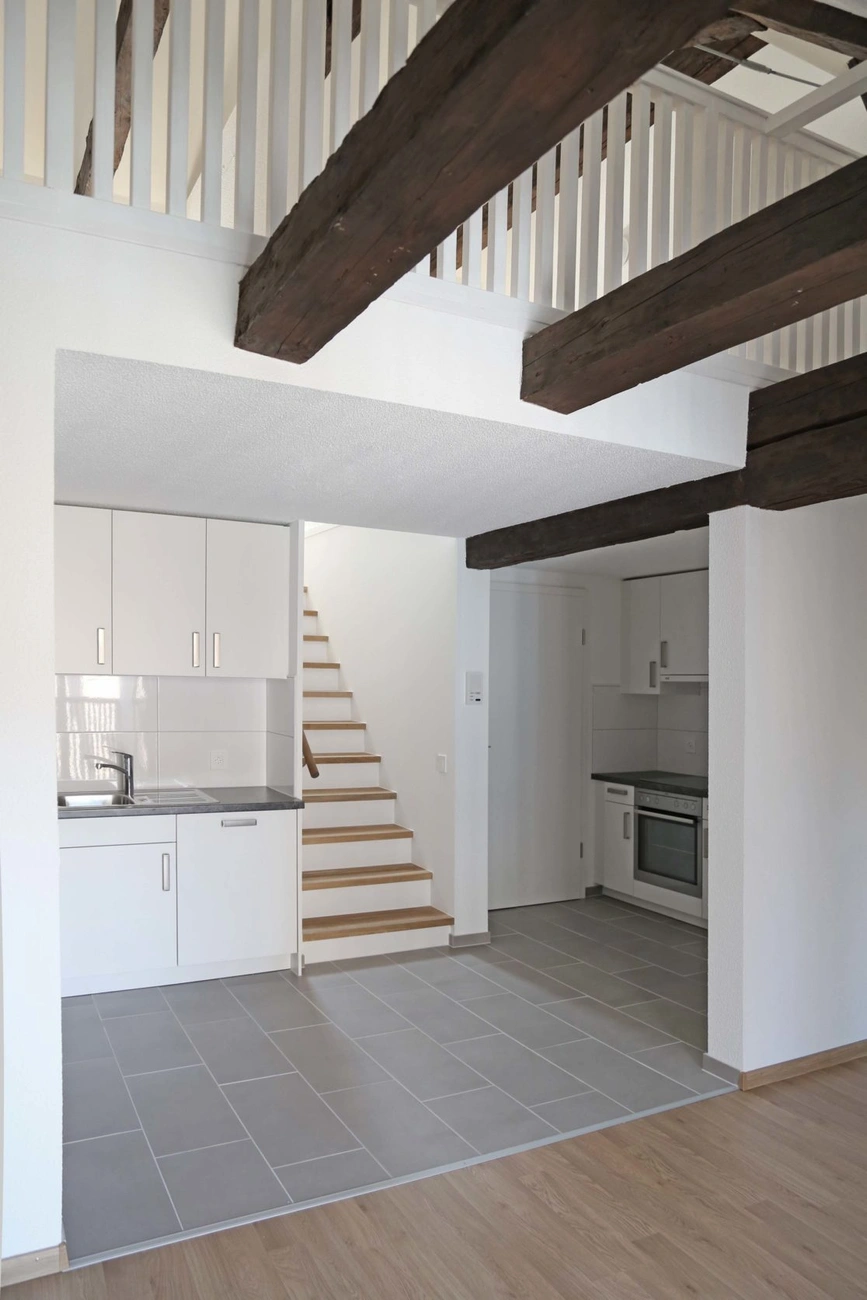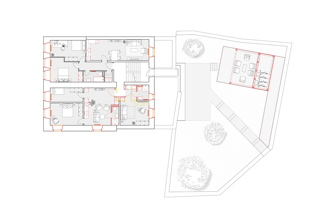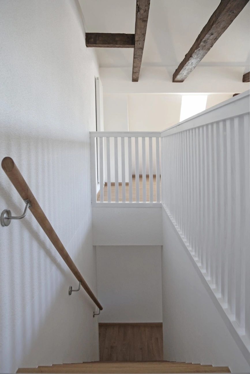 Das Dachgeschoss wurde ausgebaut und teilt sich in vier Wohnungen auf. Zwei davon sind mit einer Galerie über zwei Geschosse verbunden. Die westliche Giebelseite wird nach Fertigstellung eine hölzerne Loggia aufweisen.