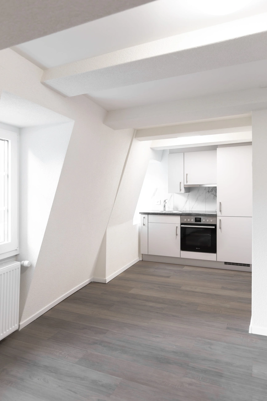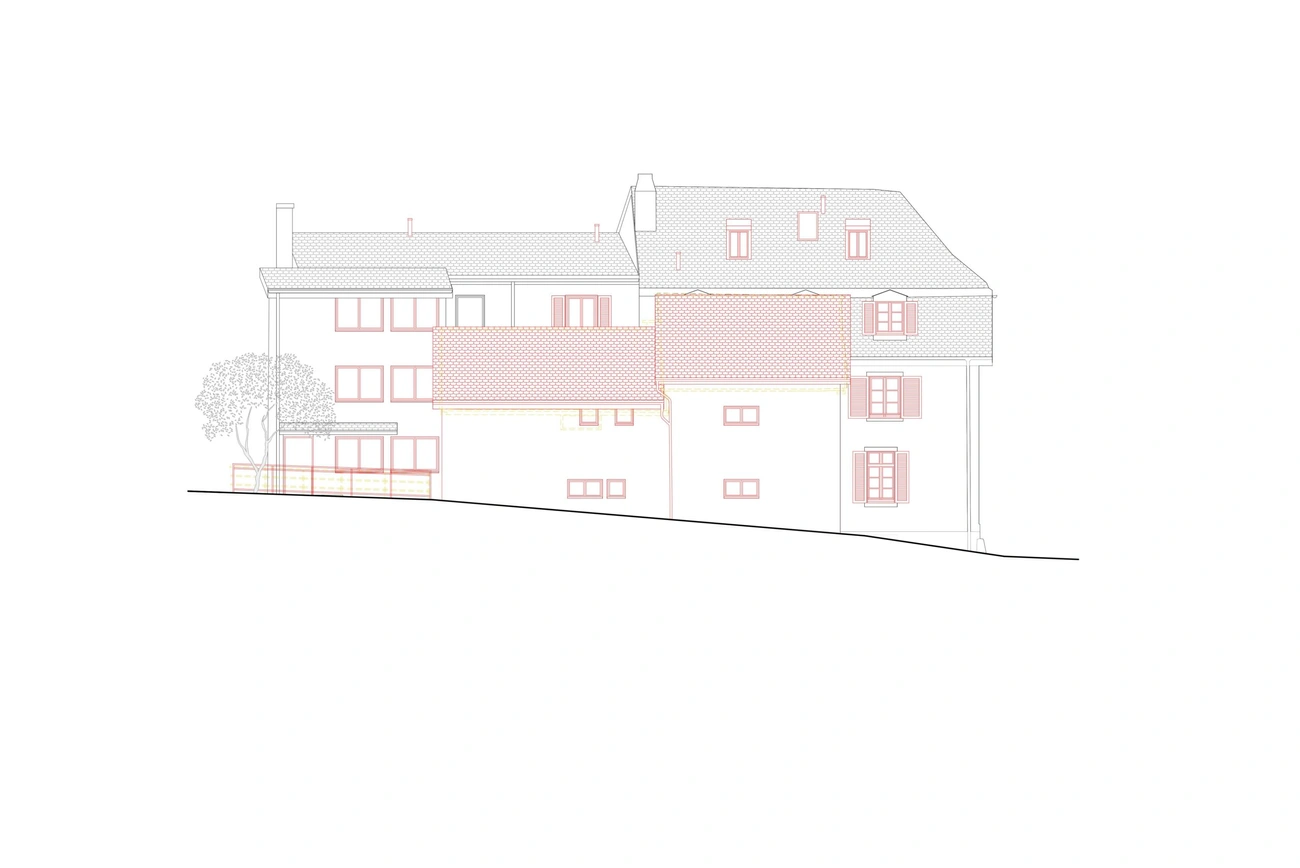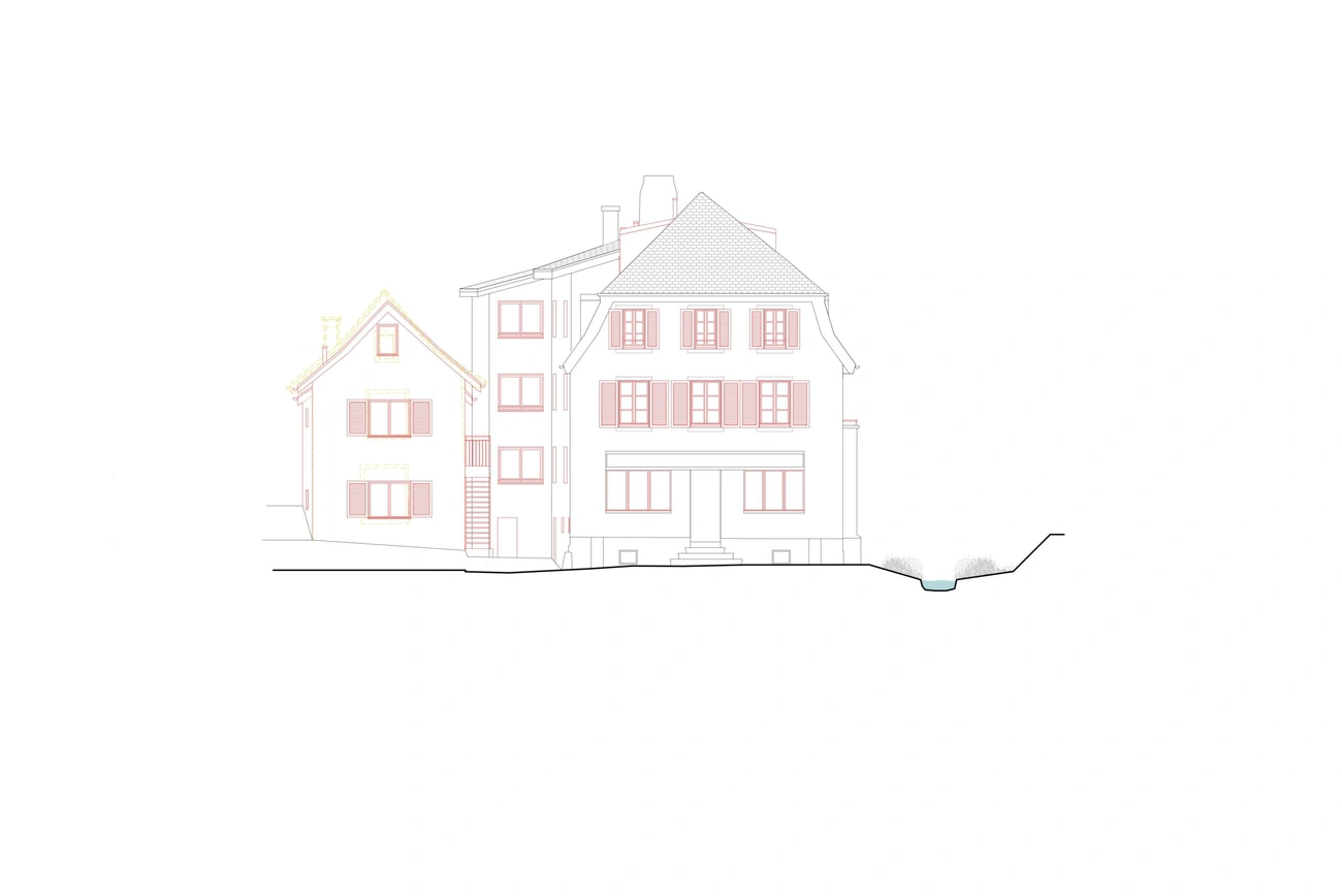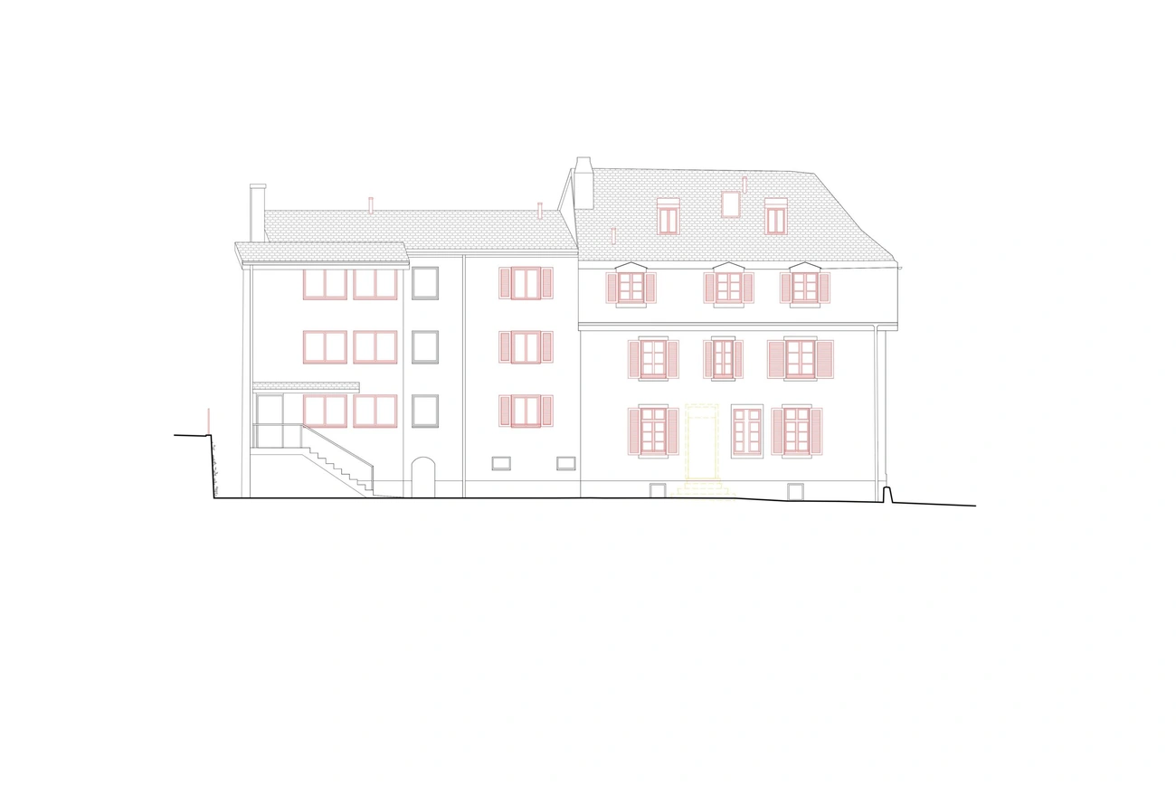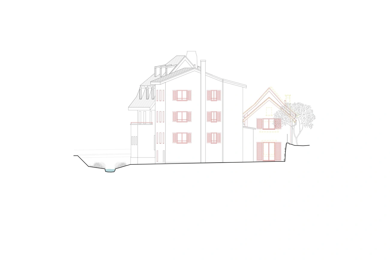 Auf der Parzelle befinden sich ein viergeschossiges langes Gebäude und daneben ein dreigeschossiges kleines Gebäude. Innerhalb des Gebäudeensembles wurden 14 Wohnungen und 2 Büros umgebaut. Zusätzlich wurden ein neues Treppenhaus und mehrere Gauben angebaut. Die beiden Gebäude befinden sich in der Kernzone, in unmittelbarer Nähe zum Zentrum.