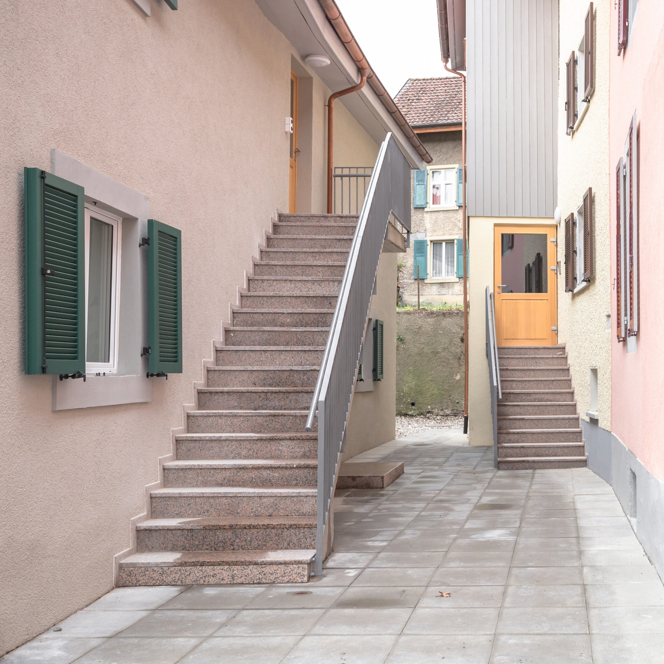 Die Nähe zum Zentrum zeigt sich auch im Farb-und Materialkonzept. Jedes Gebäude hebt sich in seiner Farbigkeit und die der Fensterläden ab. Zudem unterscheidet sich jedes Gebäude in der Putzstruktur. Drei Dächer wurden saniert und mit kernzonenüblichen naturroten Biberschwanzziegeln eingedeckt. Die neuen Gauben passen sich in Kupfer der gesamten Farbgebung an.