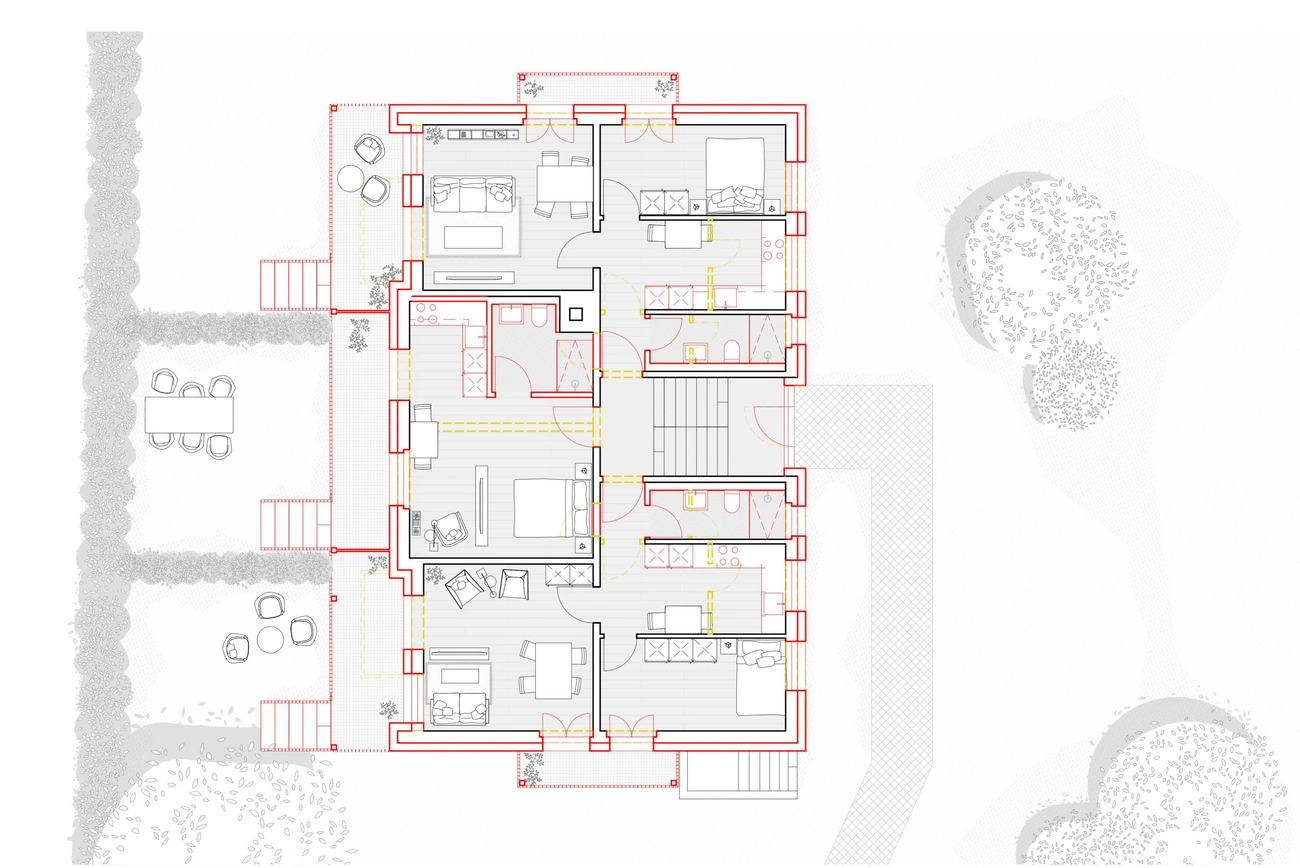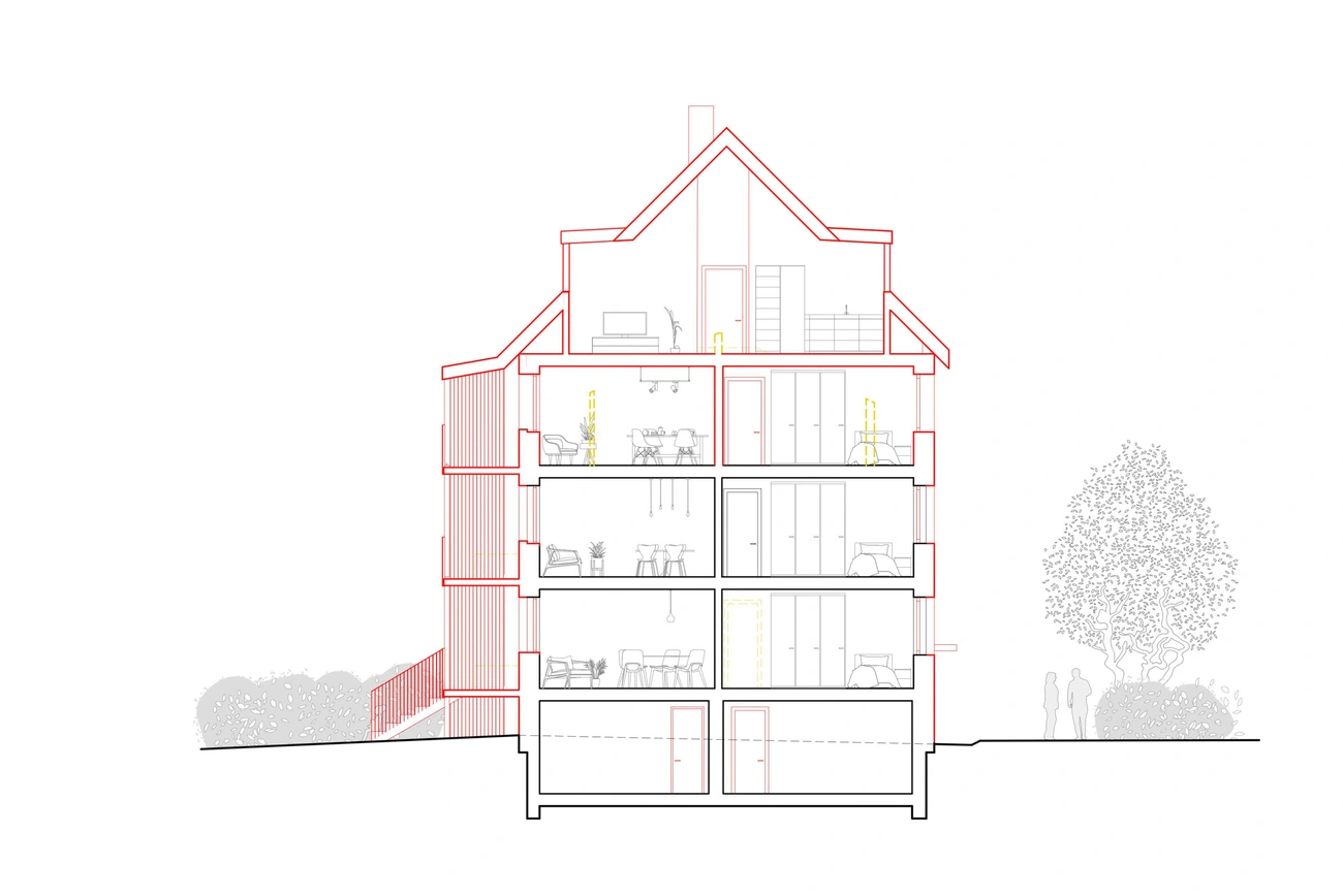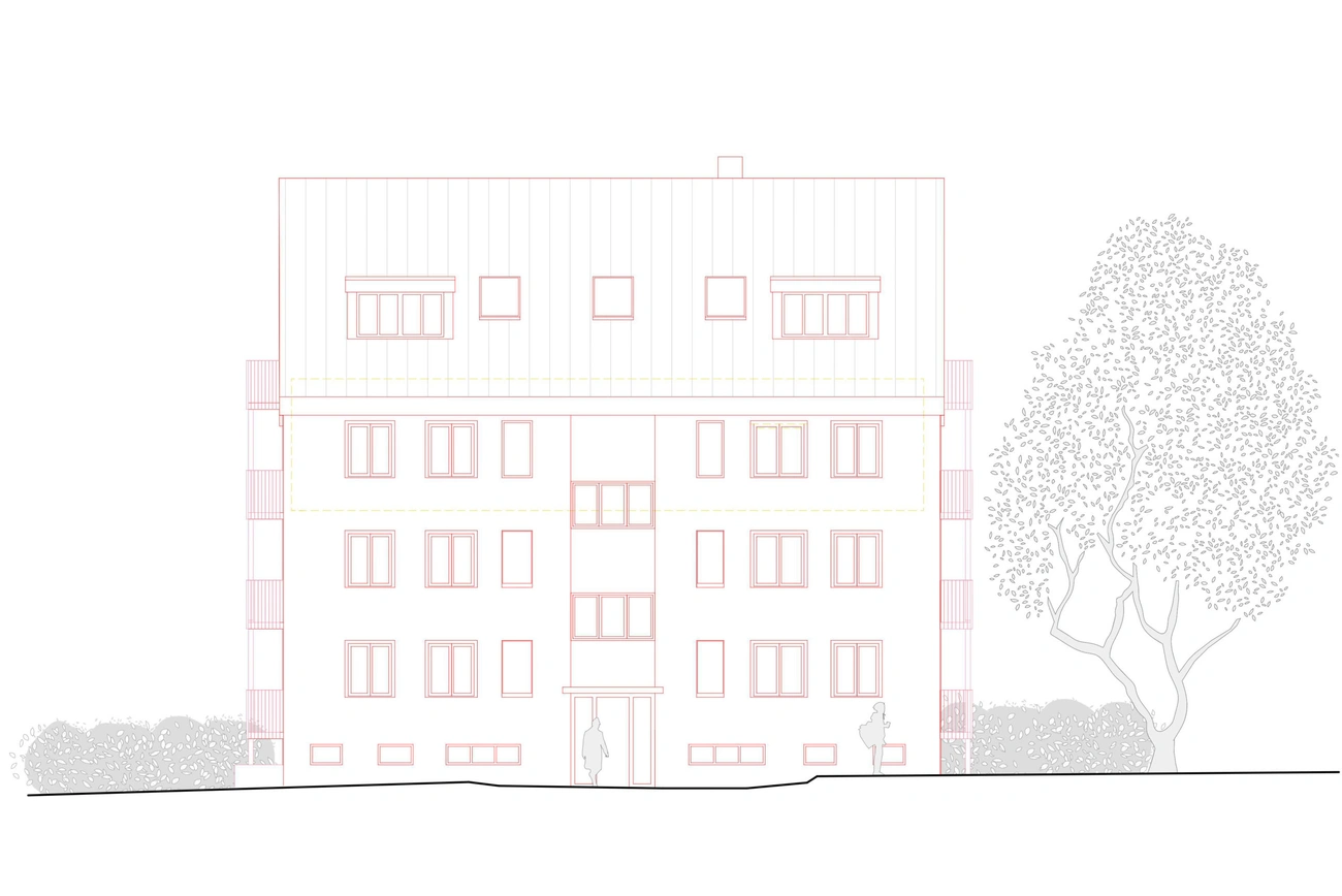 Dieser Projekt besteht aus einer integralen Innen- und Aussensanierung, verbunden mit einer energetische Sanierung, einer Aufstockung und mehrerer Balkone. Der bestehende Grundriss ist ein Mehrfamilienhaus der in 5 Wohnungen verteilt wird.