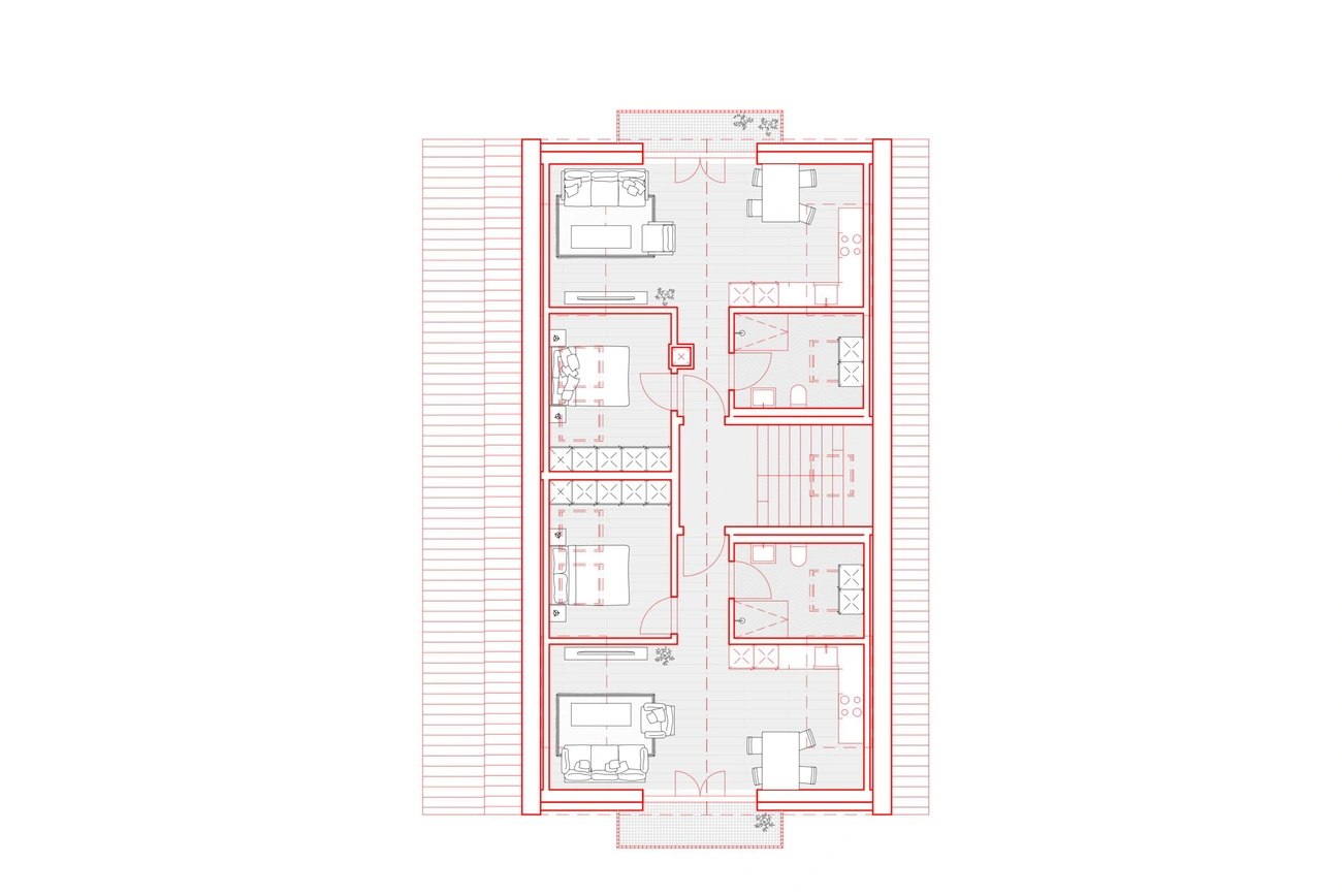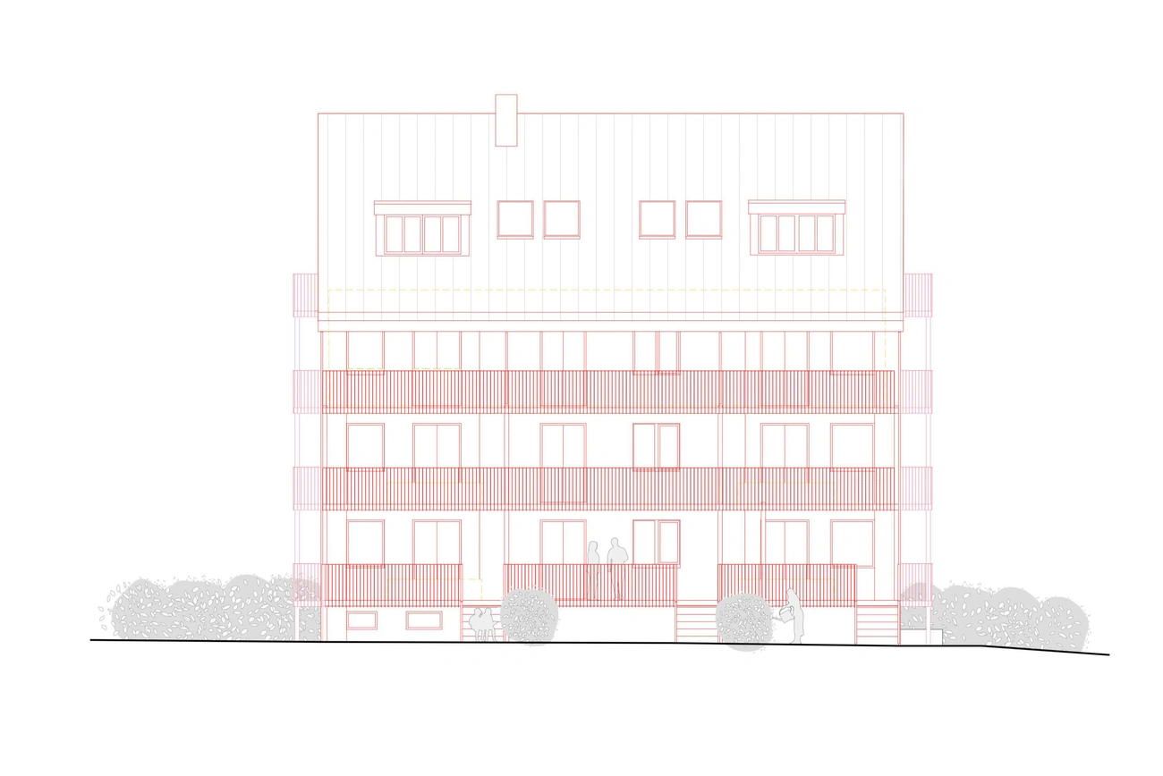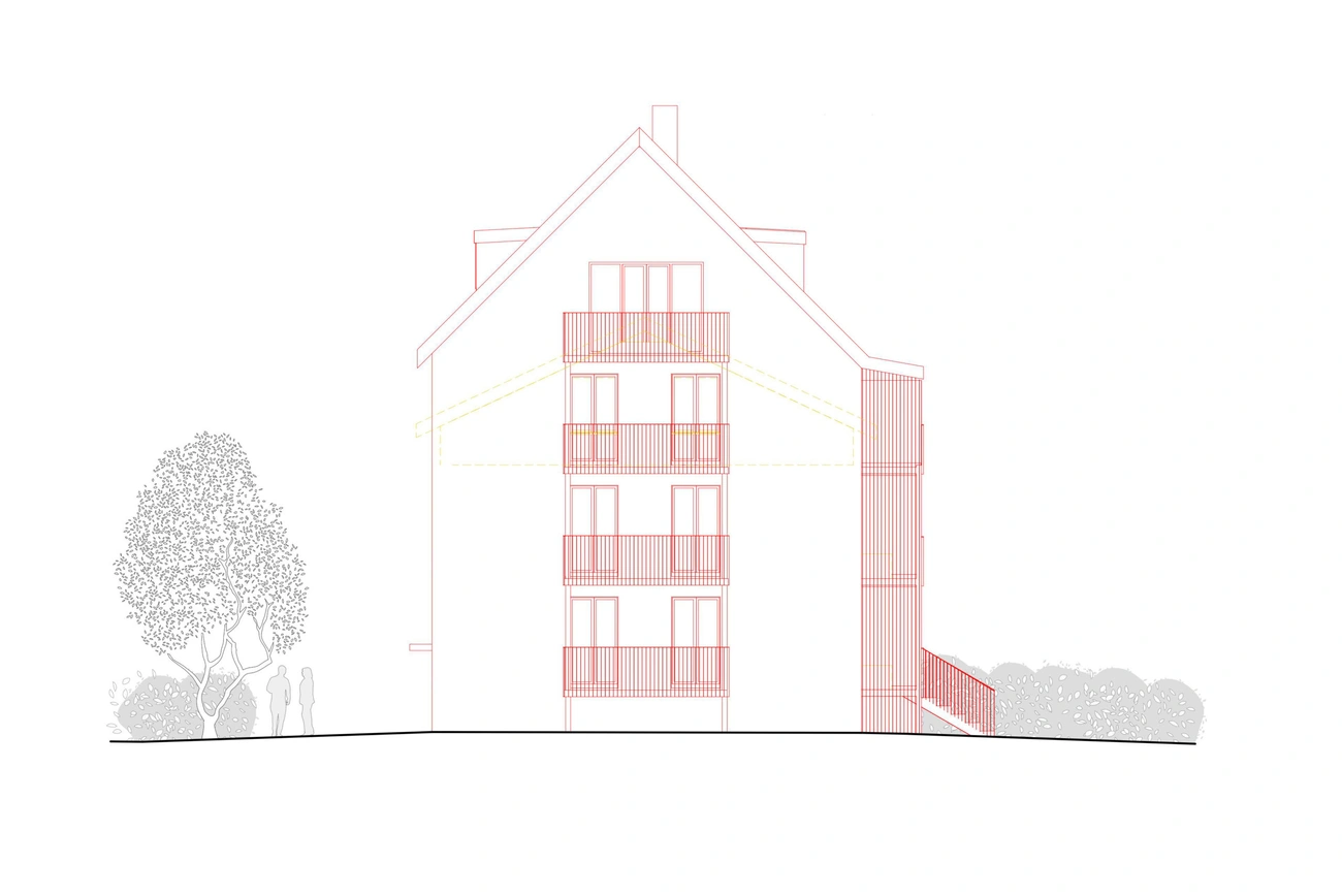 Die Materialität des Projektes unterscheidet das bestehende Gebäude und die Aufstockung. Die Sanierung wird die Fassade isolieren, die Fenster ersetzen und zwei weitere Stockwerke mit Wohnungen schaffen, die es ermöglichen, ein neues Dach zu schaffen. Aus diesem Grund wird ein neues Konzept für die Grundrisse und die Fassade entworfen, das auch eine Optimierung der Aussenräume mit der Schaffung von Balkonen und privaten Terrassen mit sich bringt.