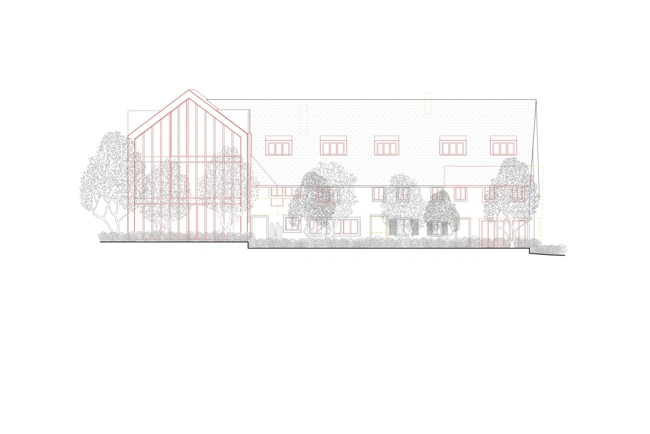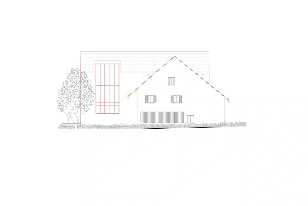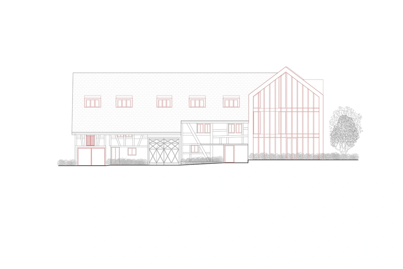 Die Scheune wird durch einen Neubau mit sechs Wohneinheiten ersetzt. Dieser Neubau nimmt die traditionellen Elemente der Scheune auf. Durch die Neuinterpretation verbinden sich in gelungener Weise Tradition und Moderne.