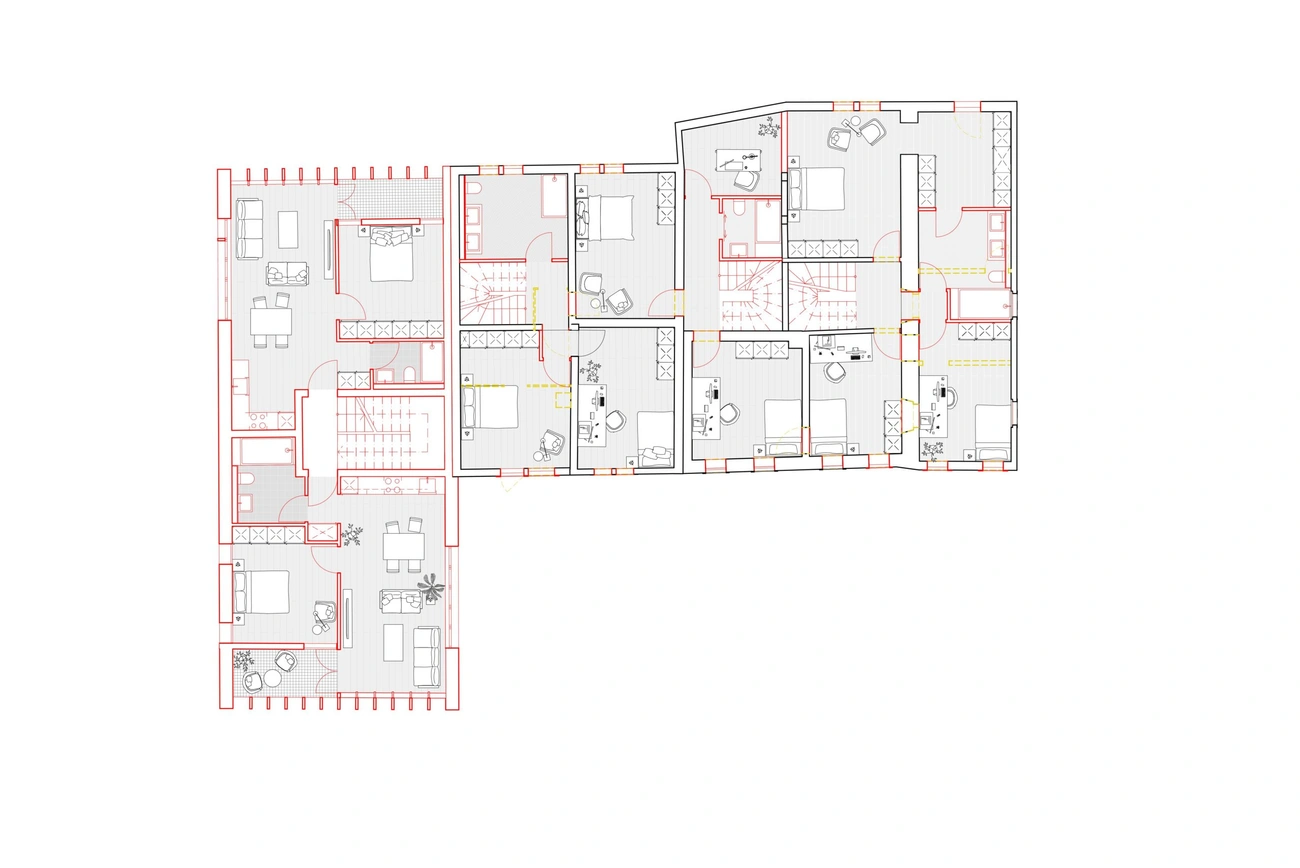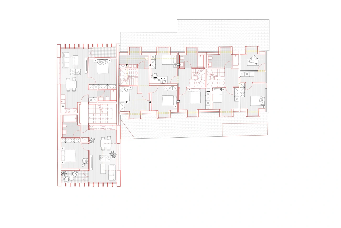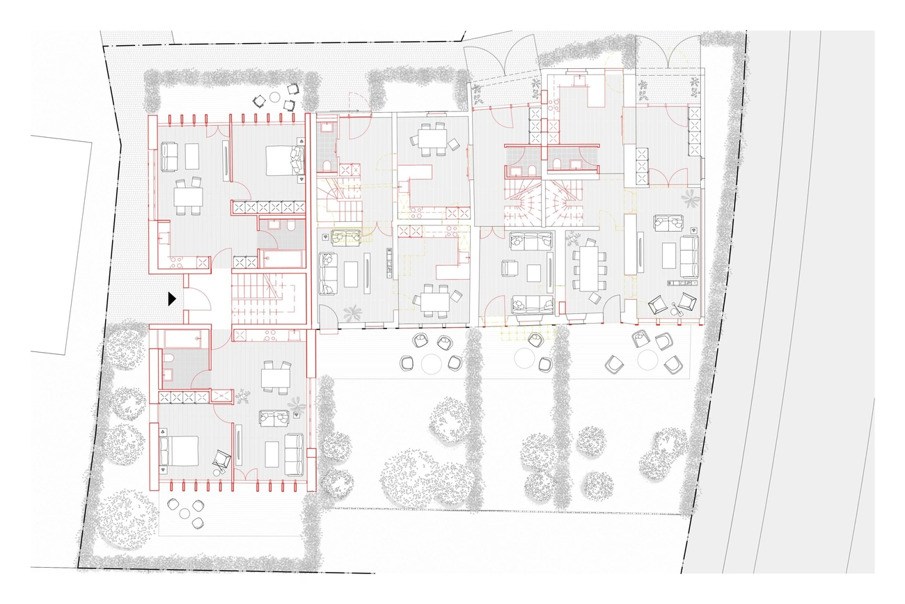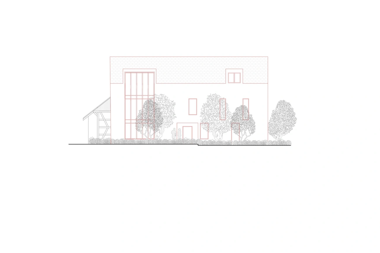 Die Scheune wird durch einen Neubau mit sechs Wohneinheiten ersetzt. Dieser Neubau nimmt die traditionellen Elemente der Scheune auf. Durch die Neuinterpretation verbinden sich in gelungener Weise Tradition und Moderne.
